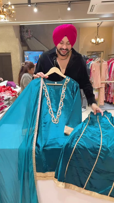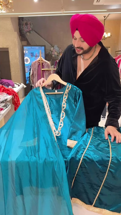 Peacock Glossy Velvet Party Wear Sharara Set with soft Organza Duppata