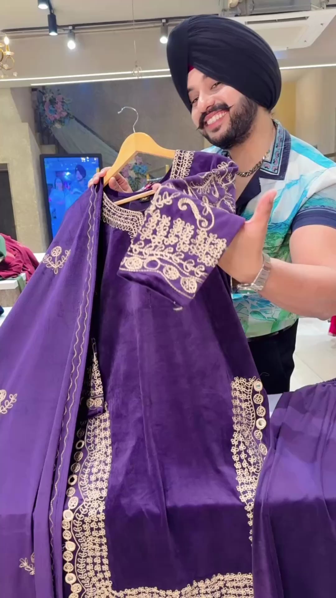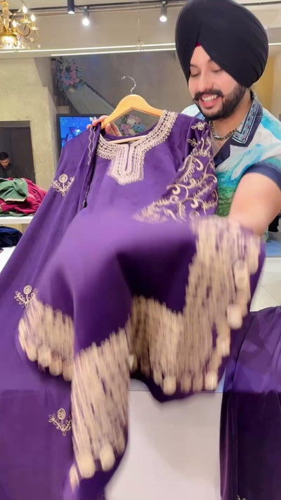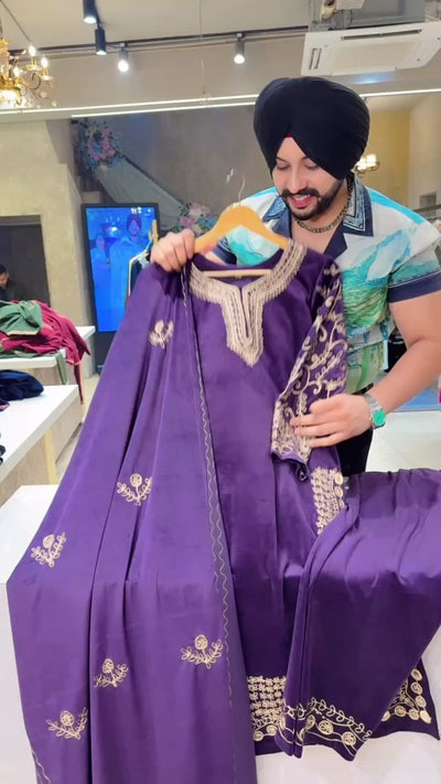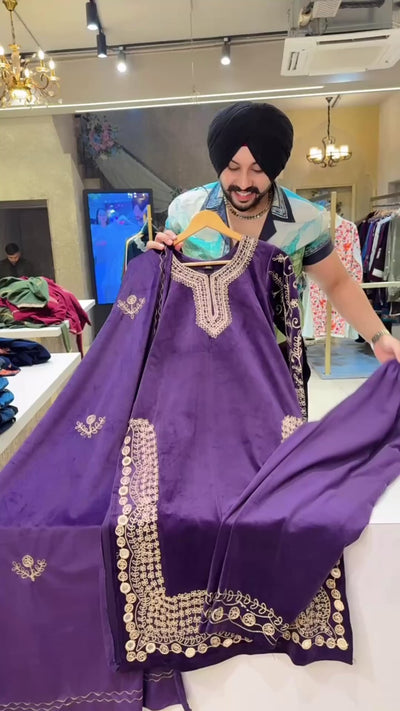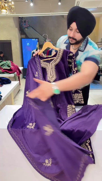 Purple Matt Velvet Strechable office Wear Embroidered Straight Suit with Embroidered Duppata