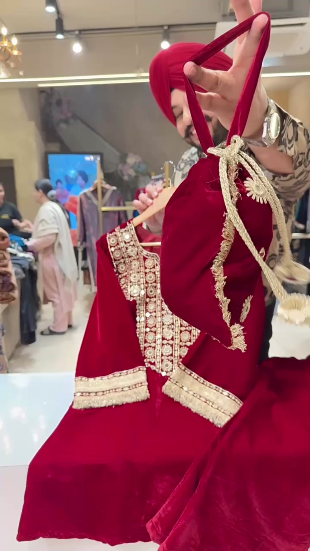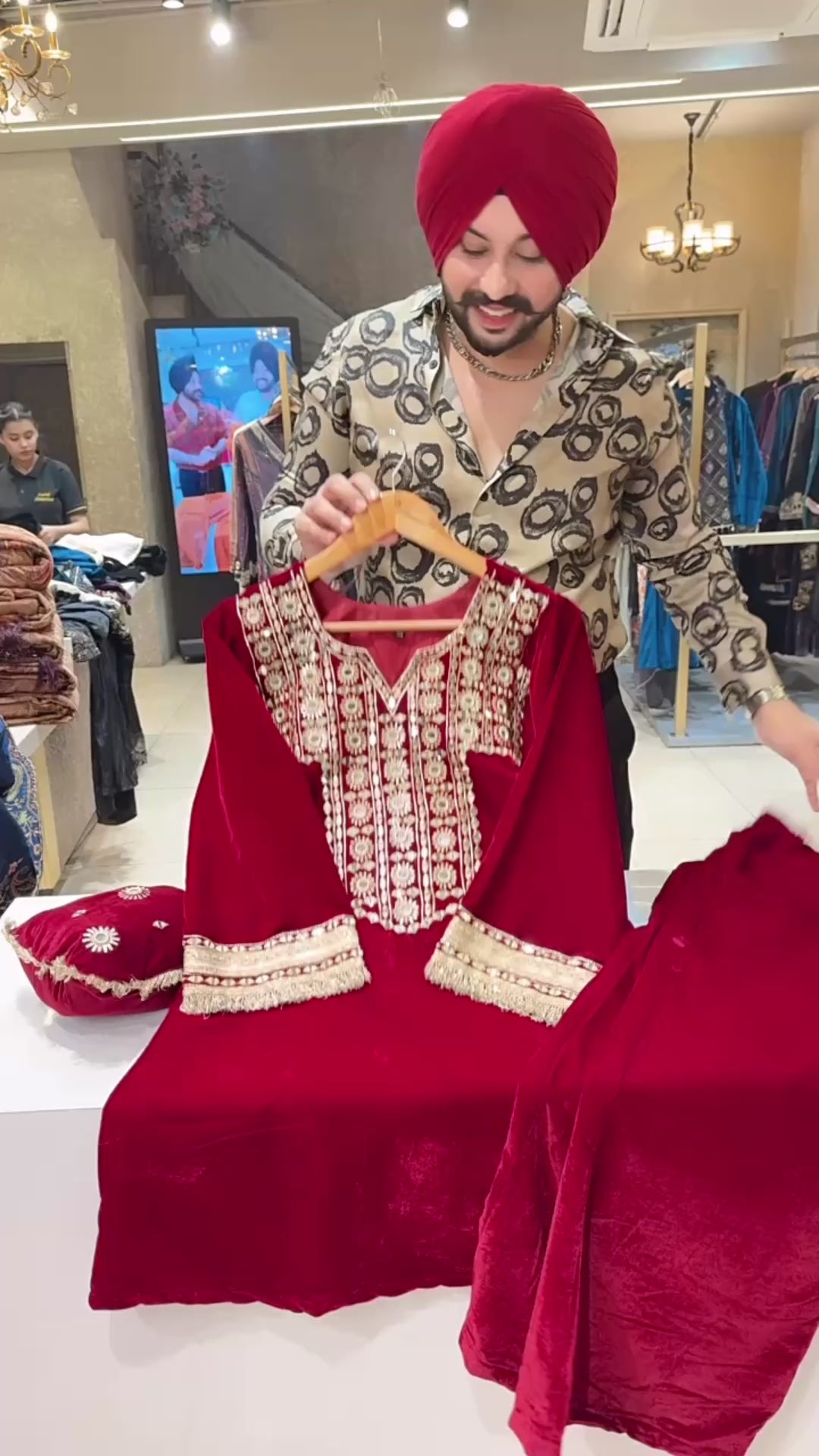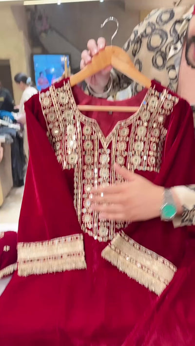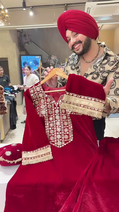 Reddish Maroon Velvet heavy Mirror & Gotta Work Party Wear Coord set with Cute Embroidered Potli
