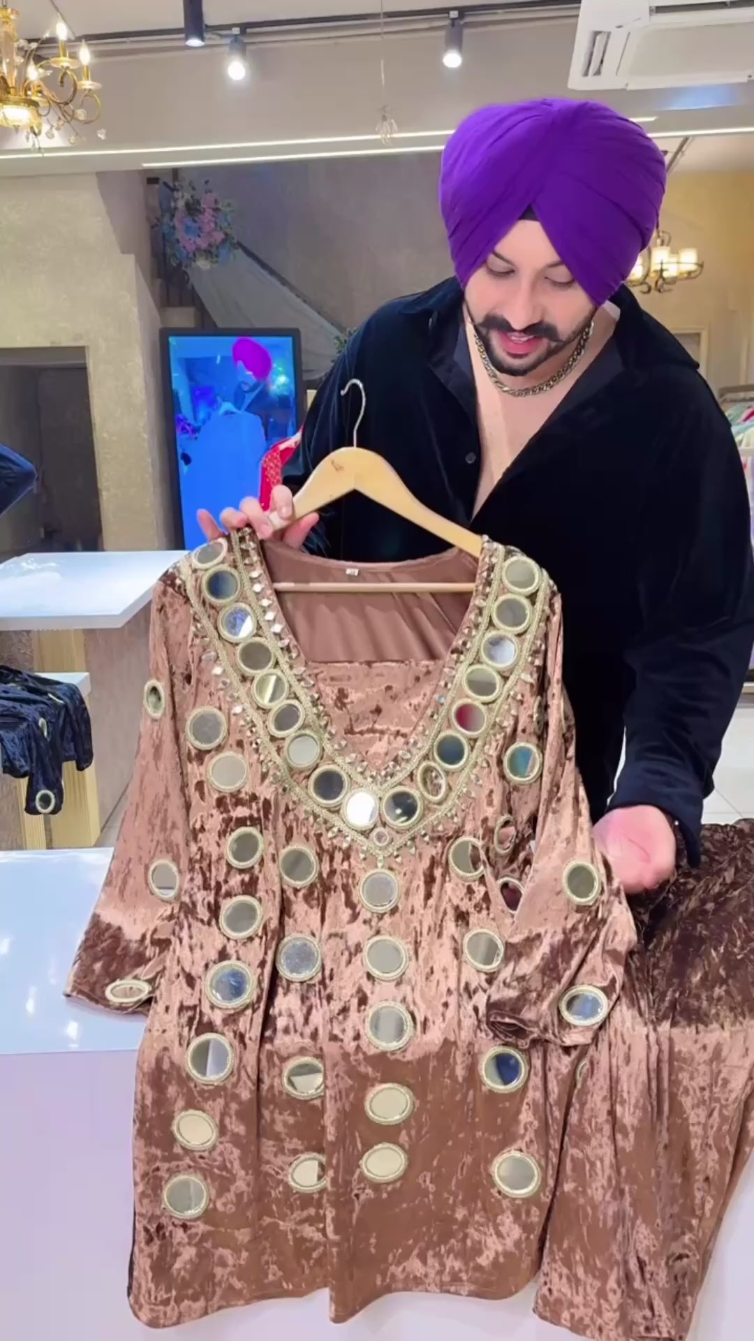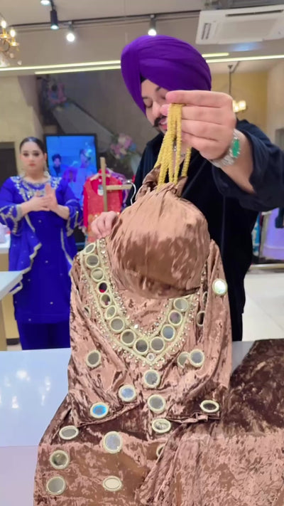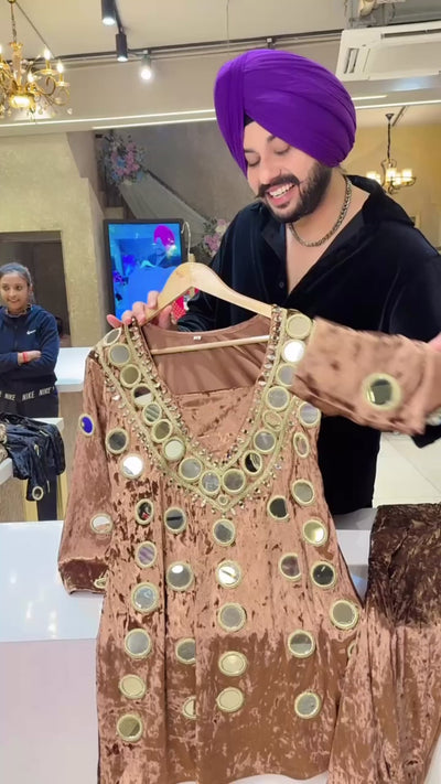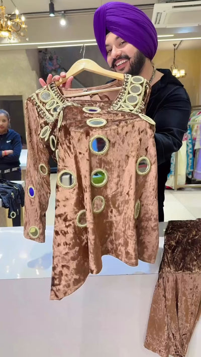 Copper Premium Stretchable Velvet Heavy Mirror work Paplum Coord set with Stylish Potli