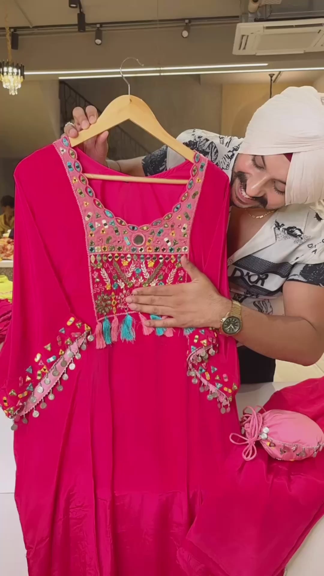 Crepe Rani pink Kashmiri Phiran Coord set with Mirror work on neck & cute Potli