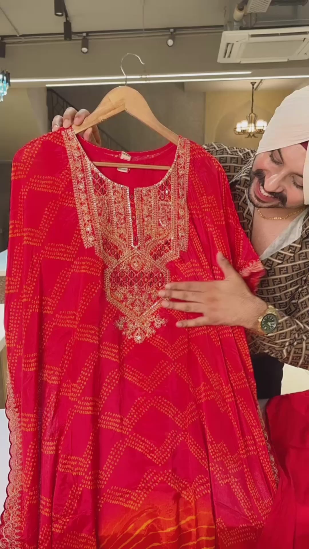 Red & orange Chinon Bandhej print Kaftan Coord set with beautiful Embroidery work