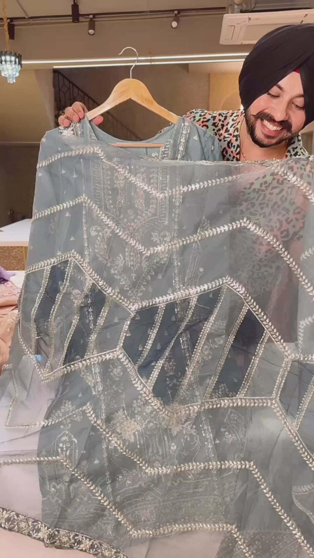 Greyish Blue Organza heavy embroidered Pakistani Suit with Beautiful Duppata