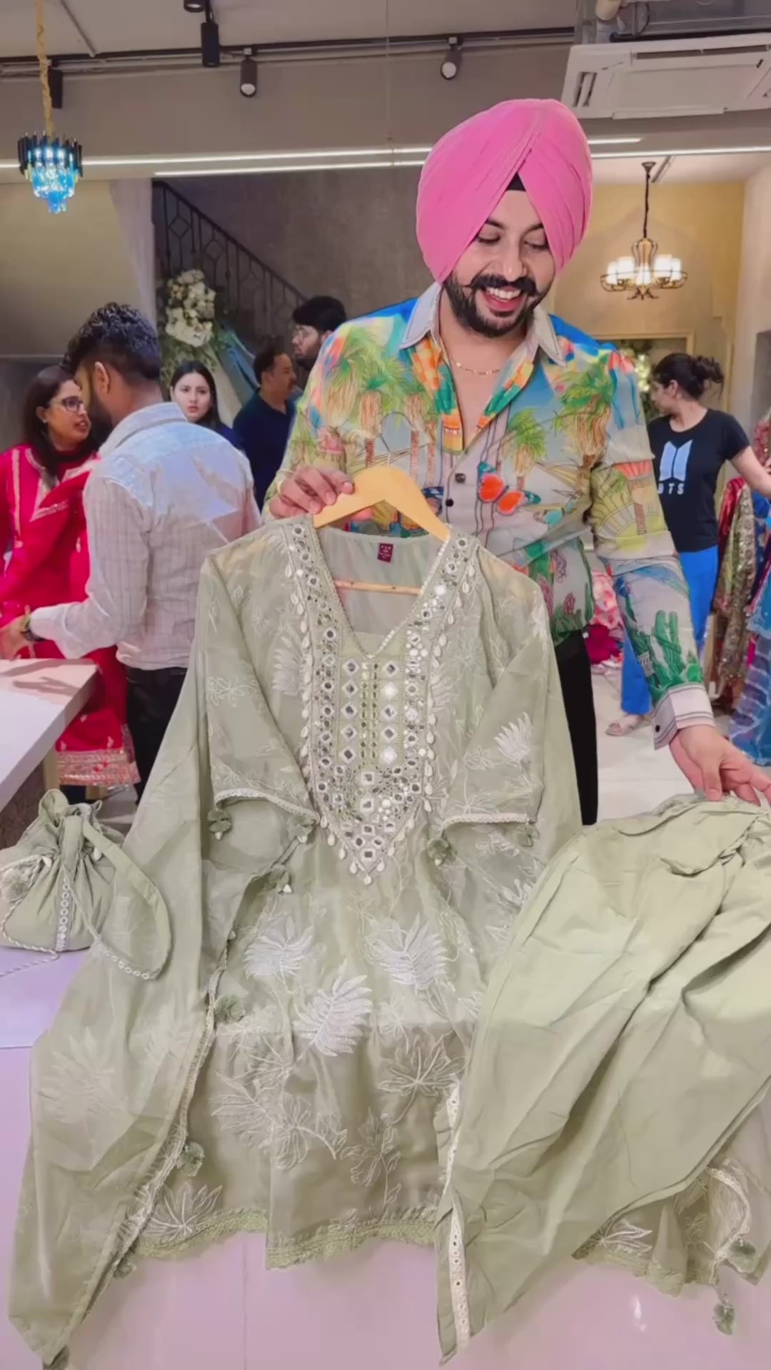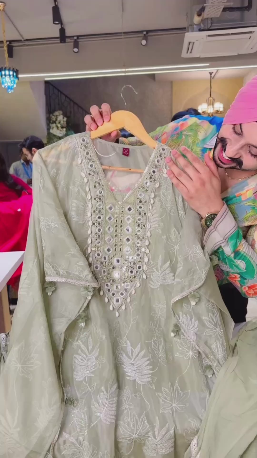 Light olive Green organza Fully embroidered Kaftan Coord set with cute Potli