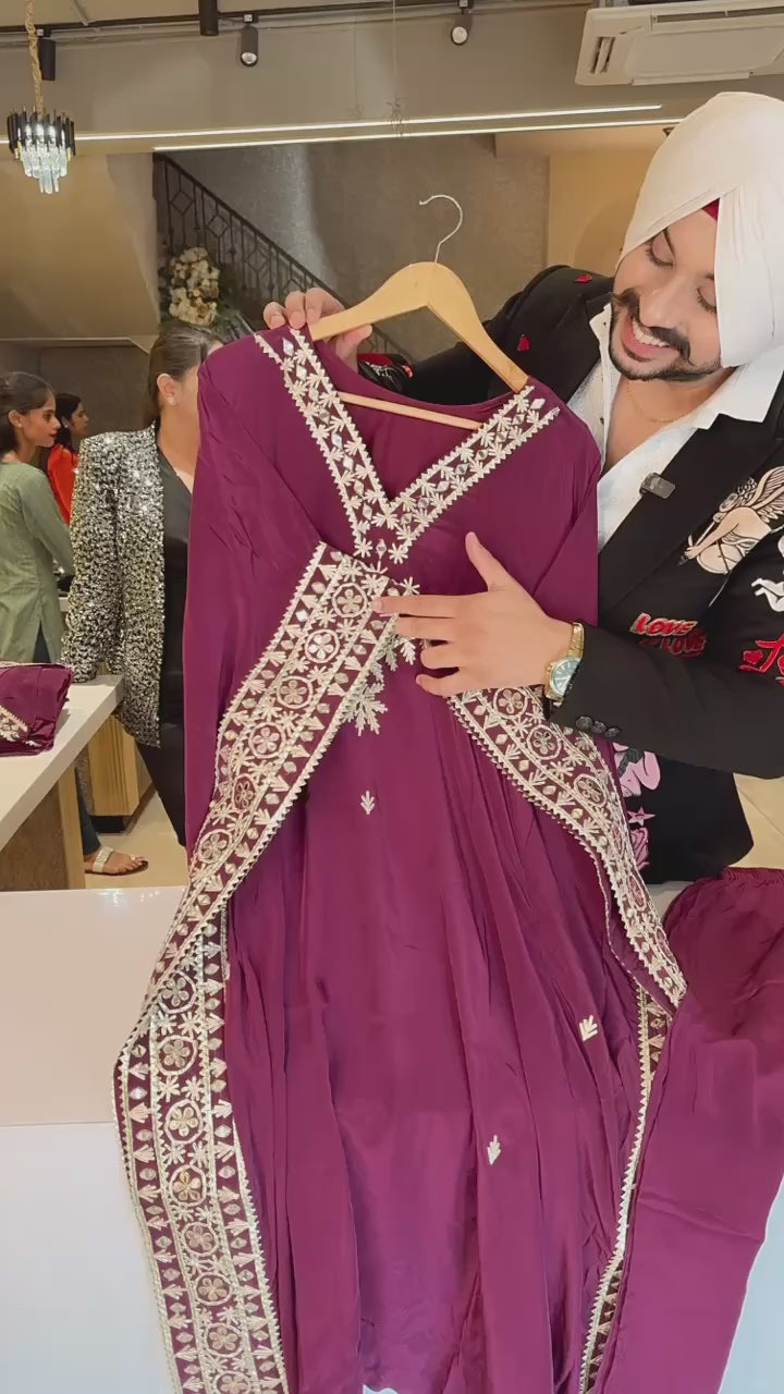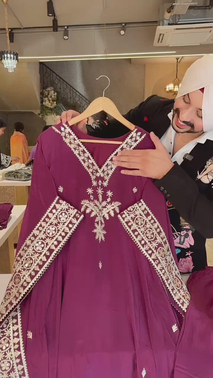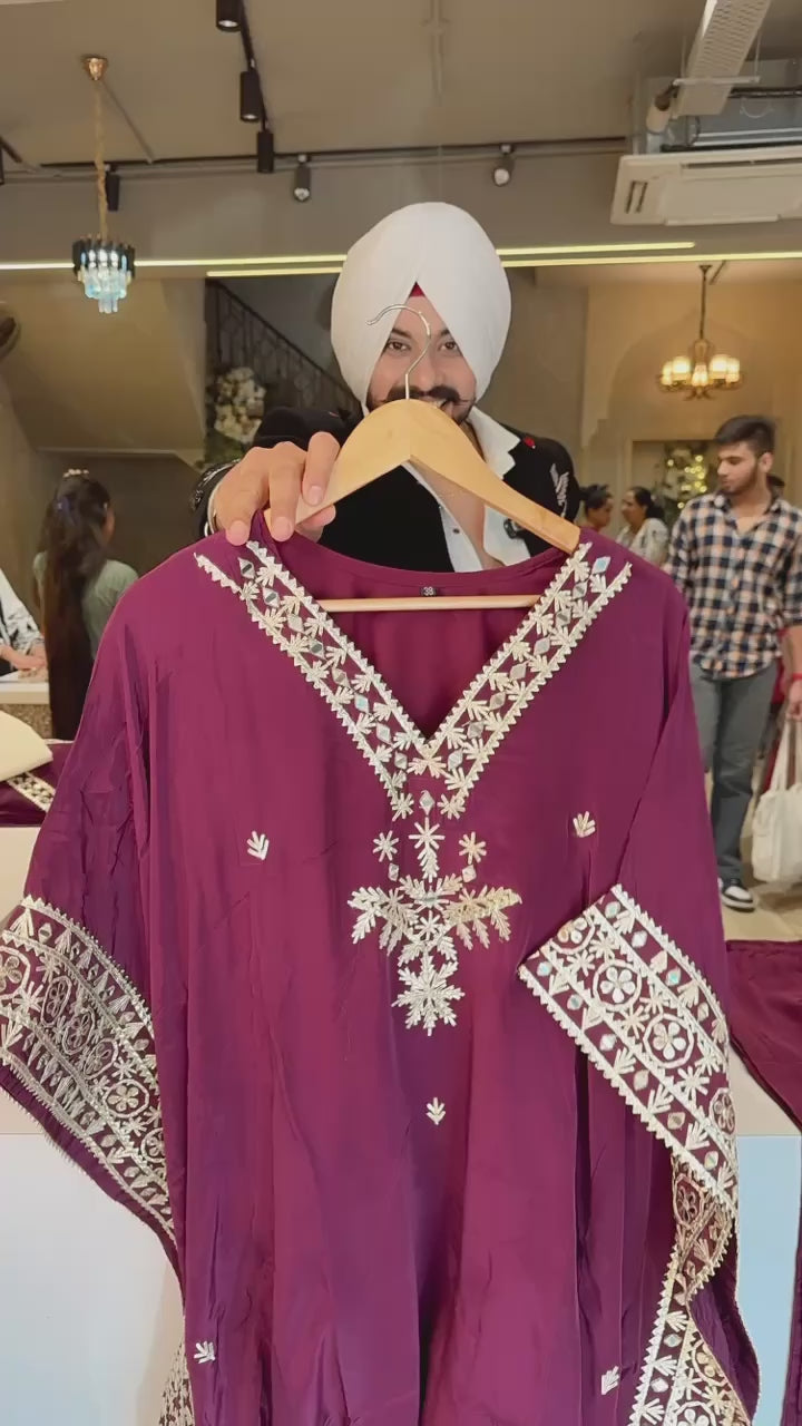 Wine Crepe Heavy gotta Embroidery & mirror work Kaftan Coord set