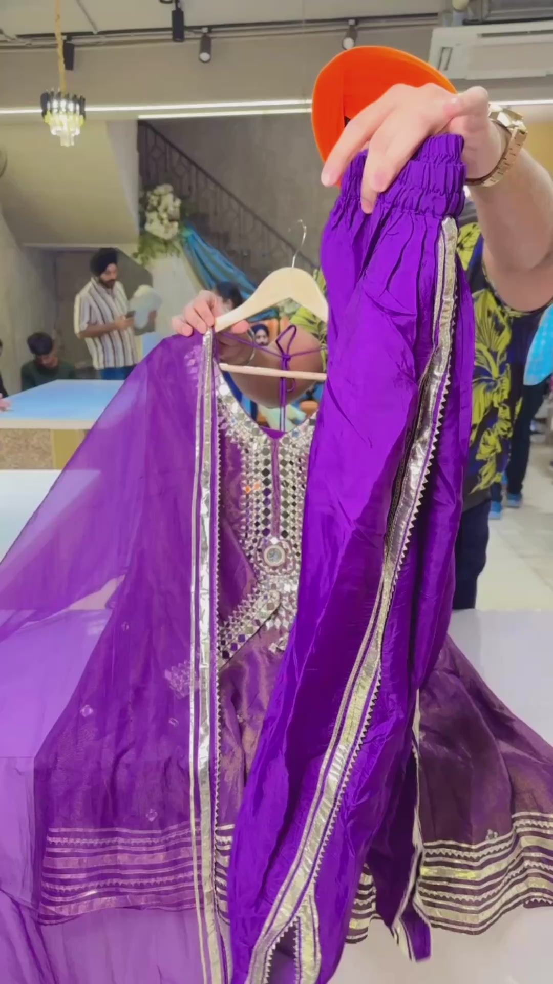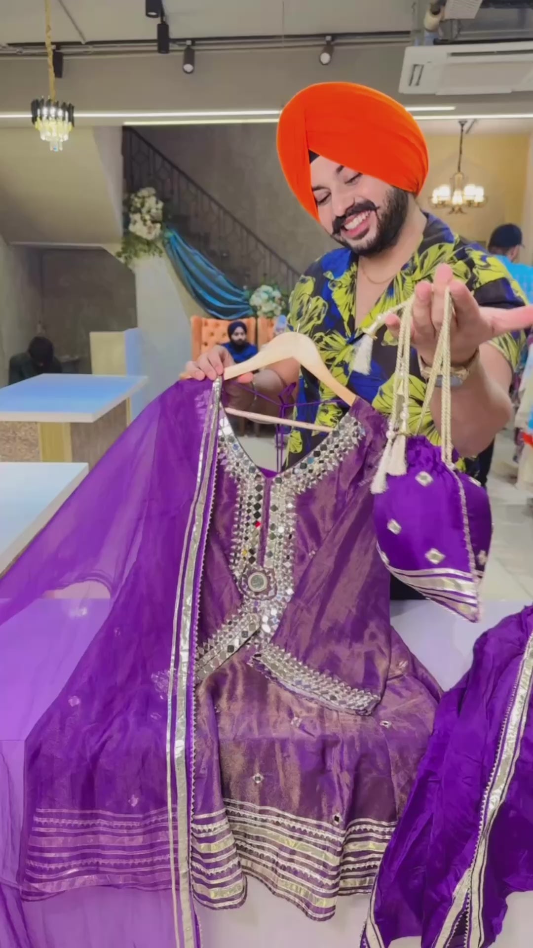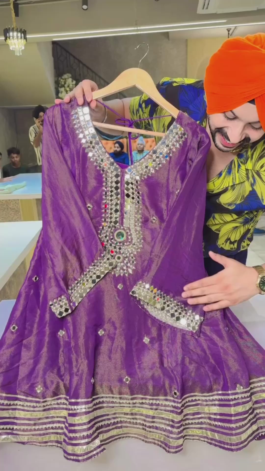 Purple Shimmer Tissue Silk paplum Dhoti Set with cute Potli & mirror work on neck