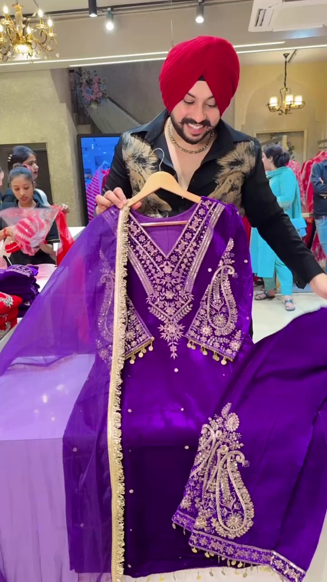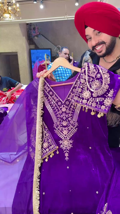 Purple Glossy Velvet Indowestern Straight Suit Woth Heavy embroidery Work on neck Sleeves & Pants