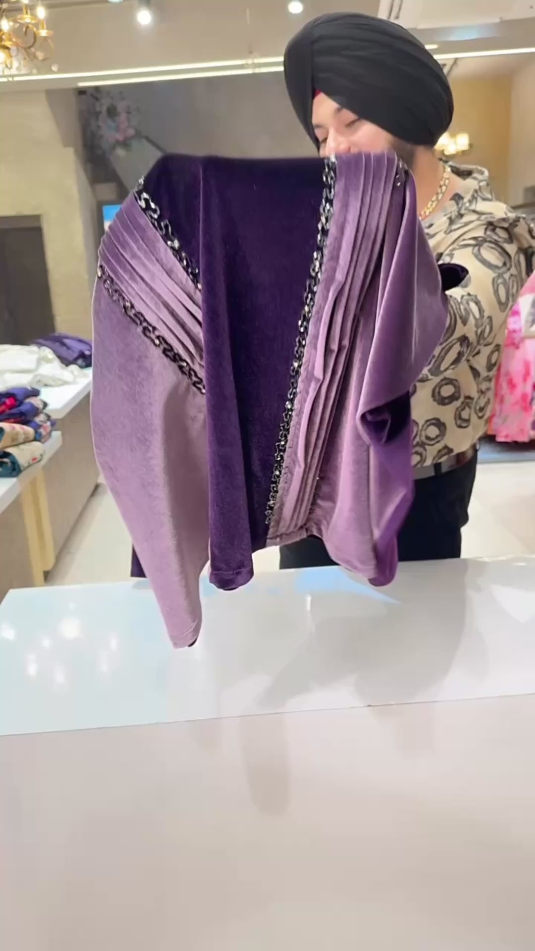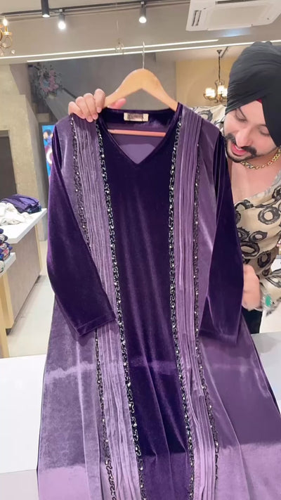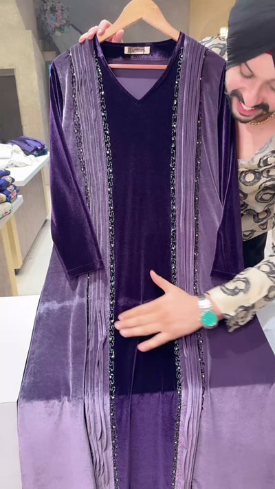 Purple & Mauve Premium Stretchable Velvet Hand Embroidered Party Wear Dress