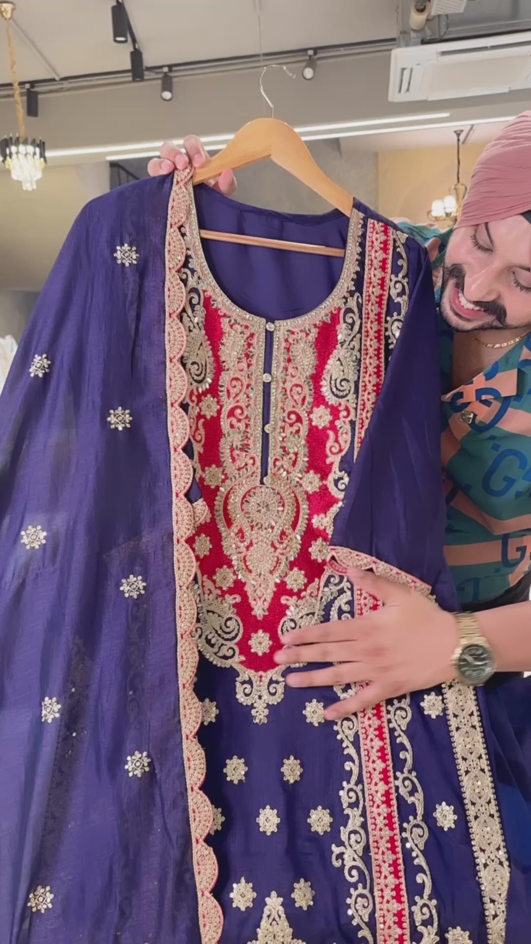 Dark purple Chinon Heavy embroidered Straight plazo Suit
