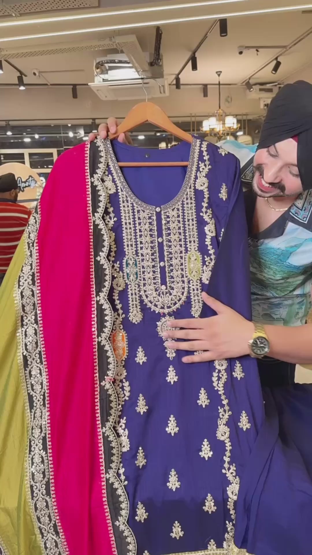 Purple Chinon heavy embroidered Straight Plazo Suit with beautiful Duppata