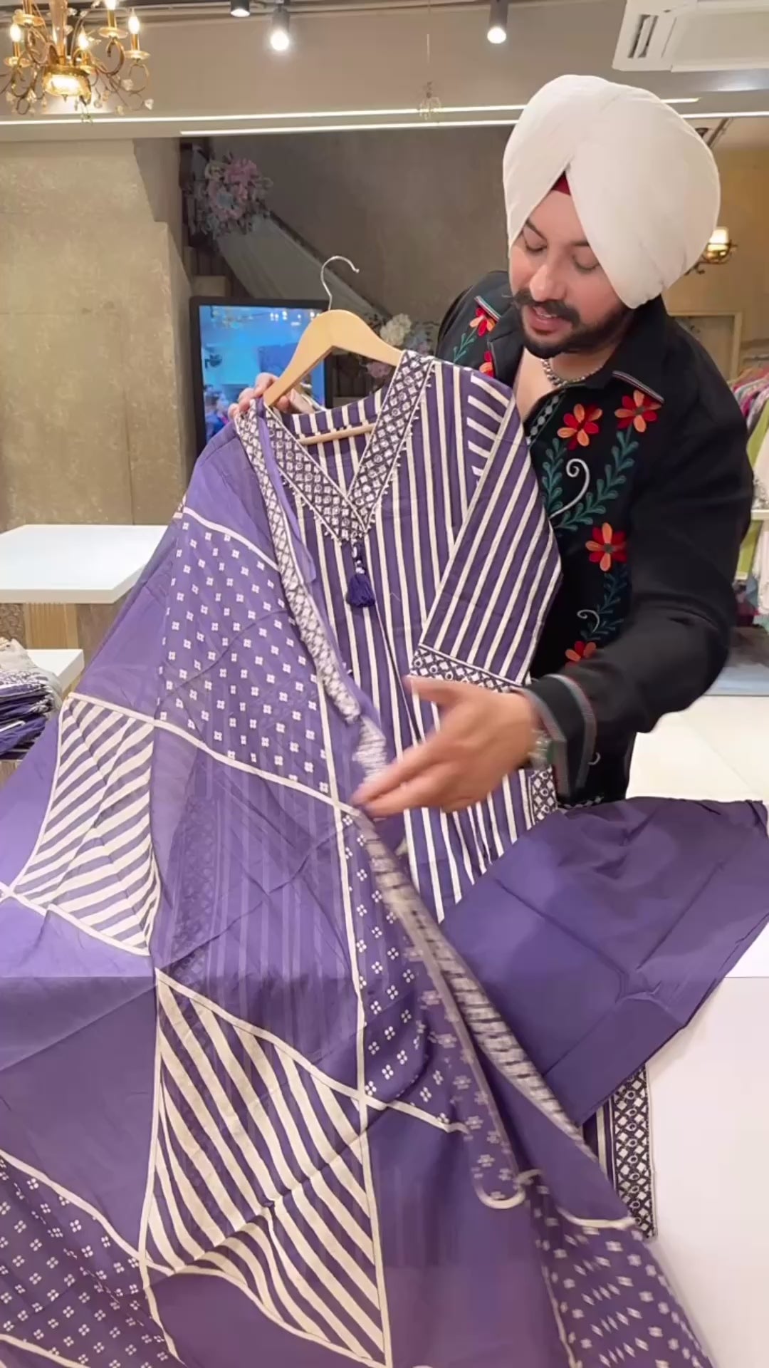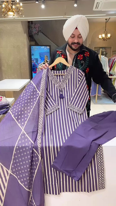 Purple Cotton Stripped Office Wear straight Suit with Sleek Hand work on neck