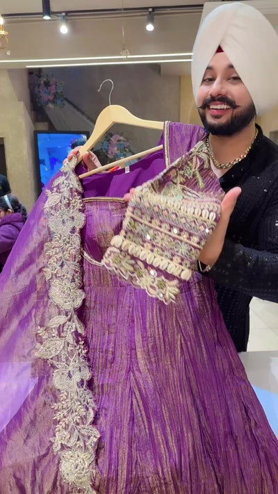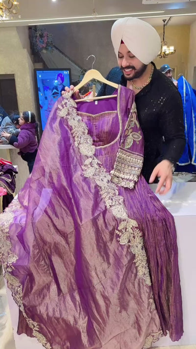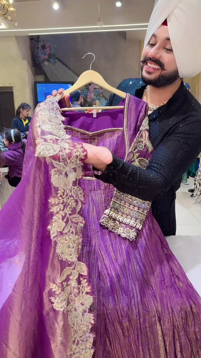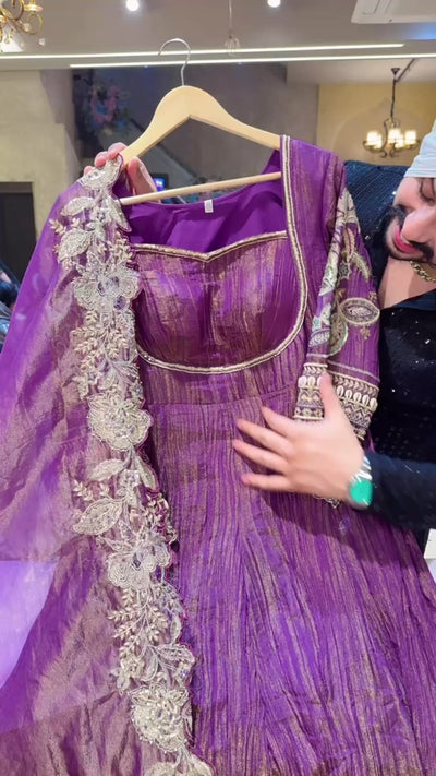 Purple Crush Shimmer Tissue Full Flair Padded Anarkali Gown With Heavy Hand Embroidery Work On Sleeves & Duppata