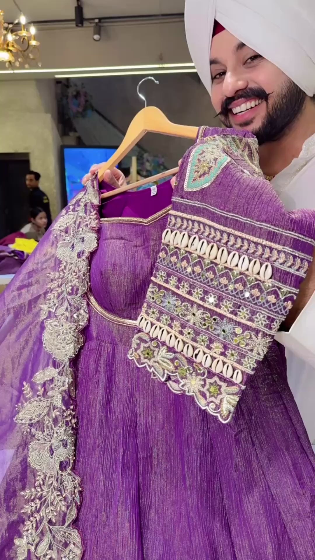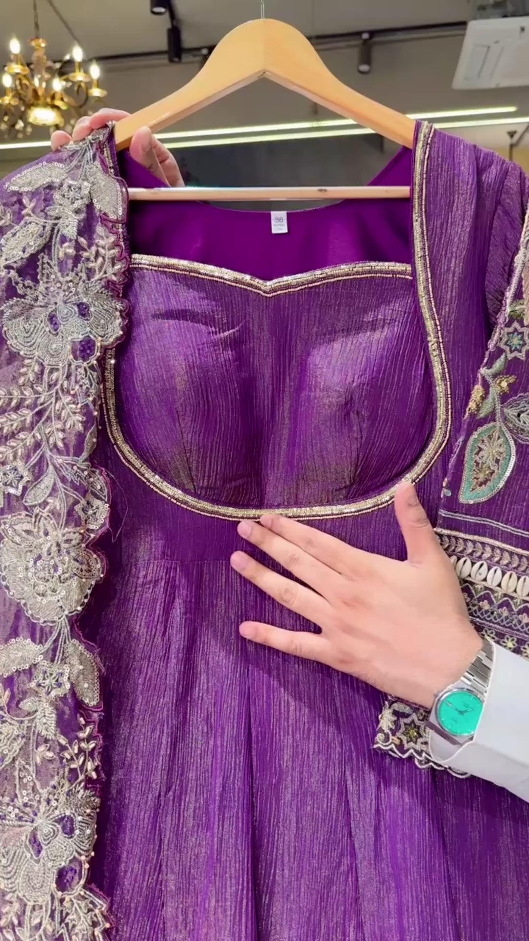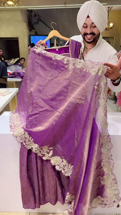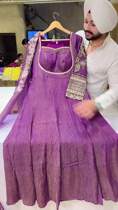 Purple Crush Shimmer Tissue Full Flair Padded Anarkali Gown With Heavy Hand Embroidery Work On Sleeves & Duppata