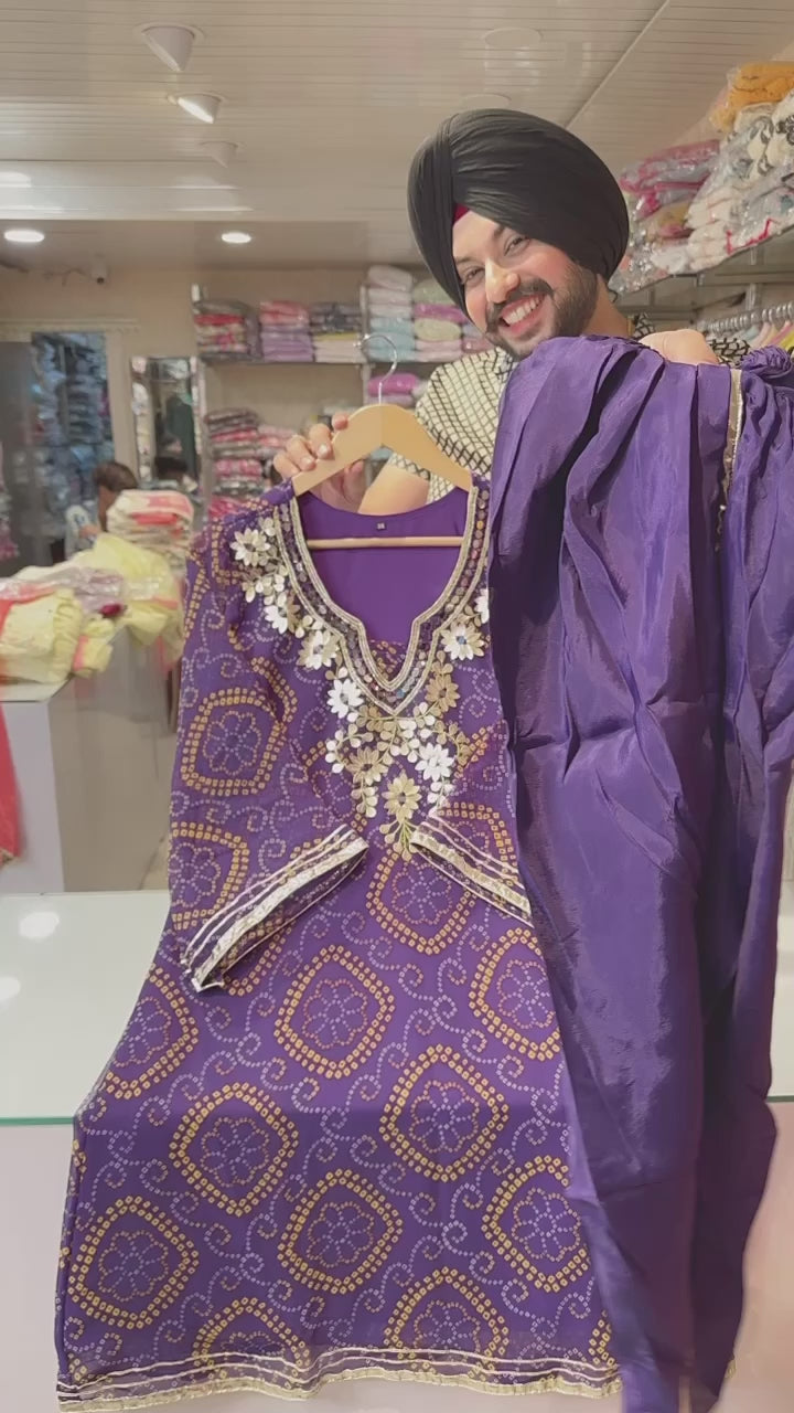Purple Georgette Bandhani Print Coord set with Tulip pants & handwork on neck