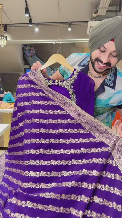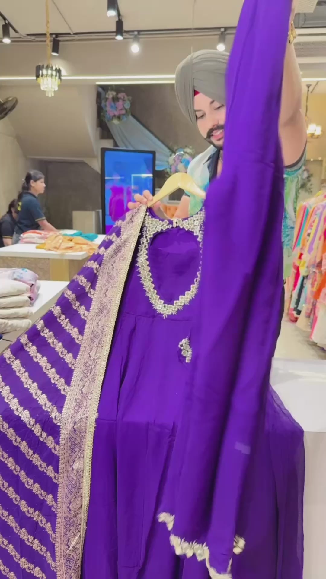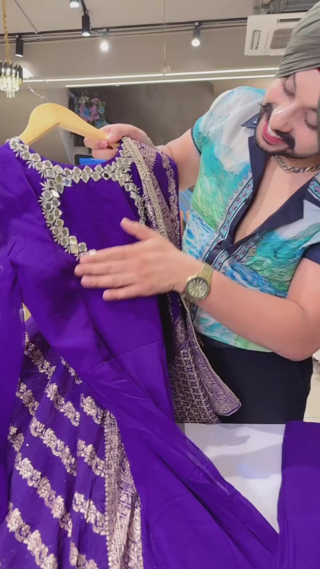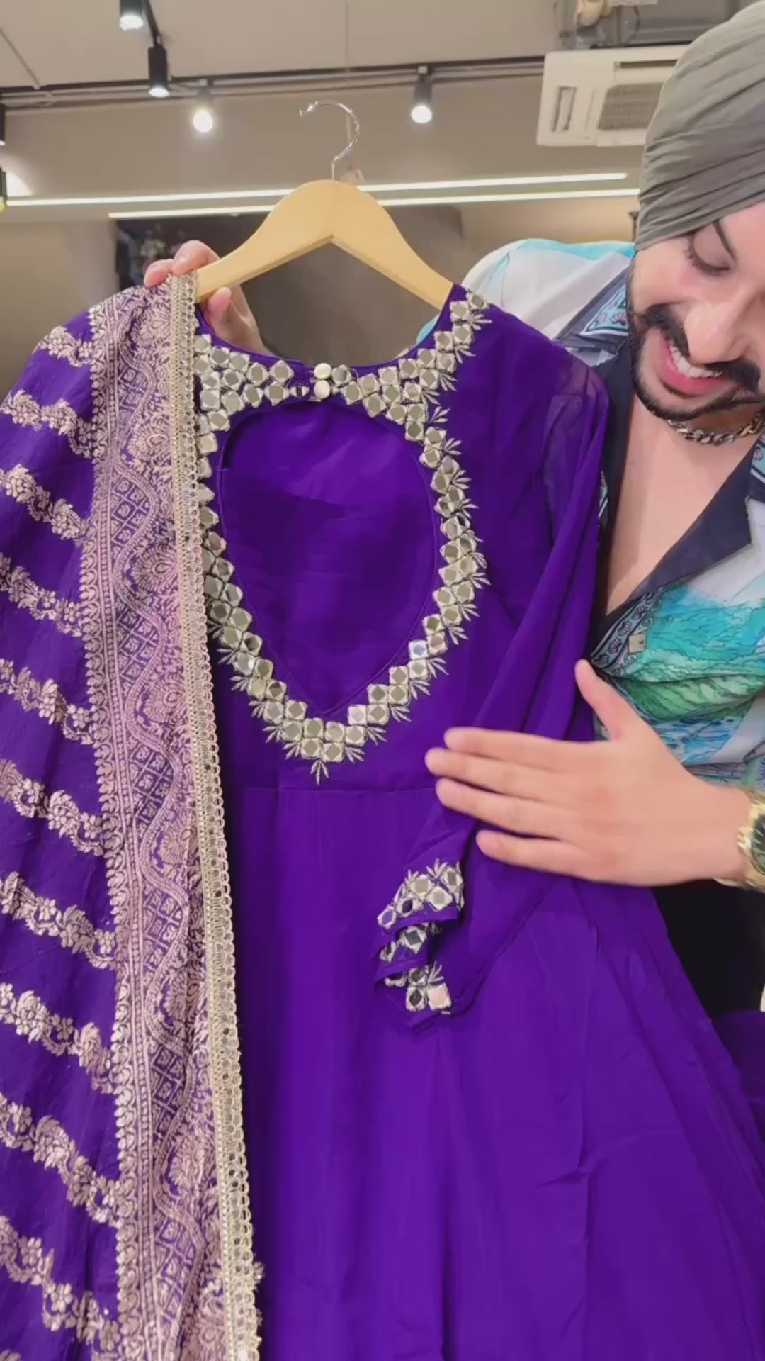 Purple Georgette Heavy Mirror work Designer neck Anarkali Suit with Beautiful Banarasi look Duppata