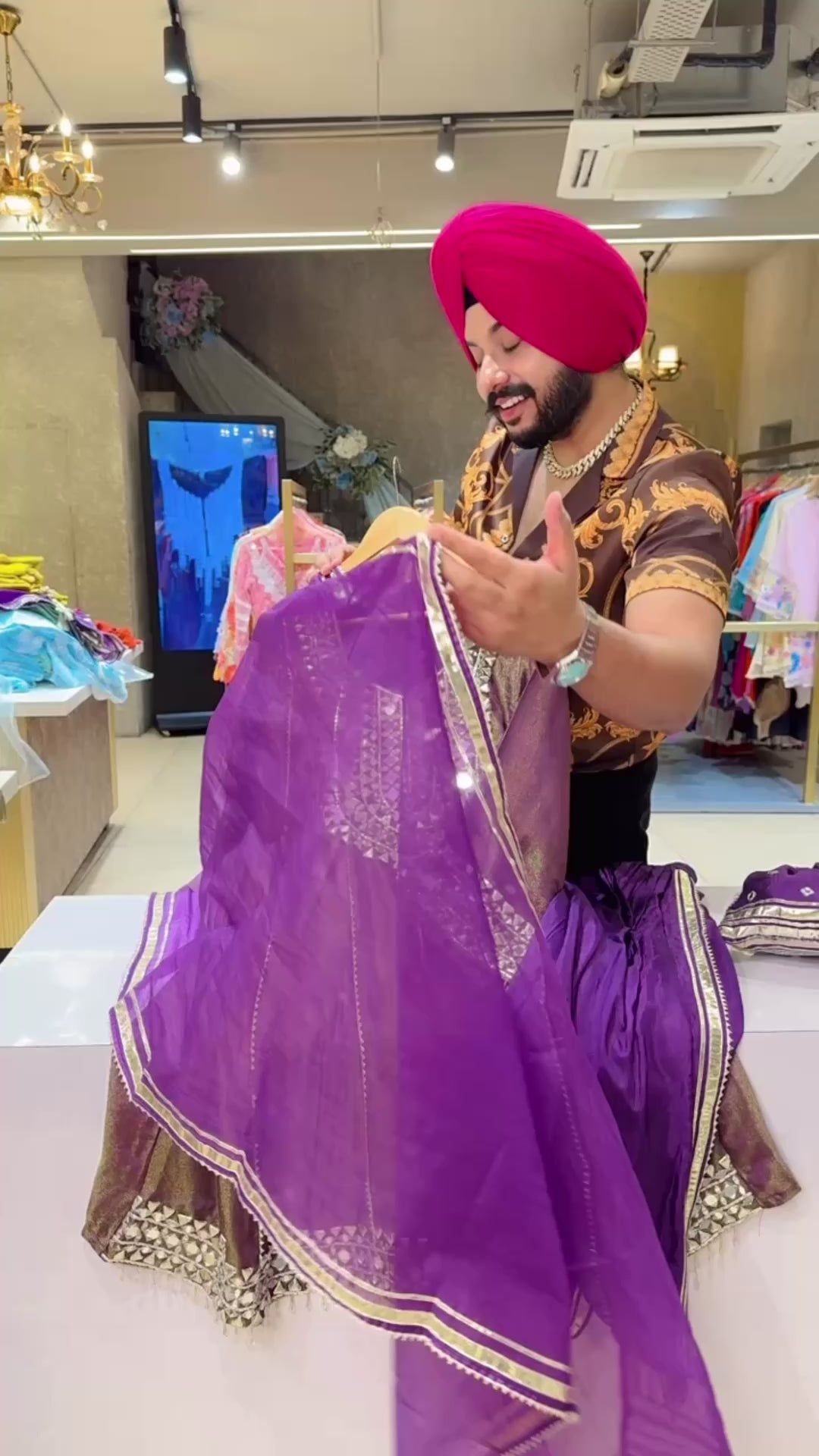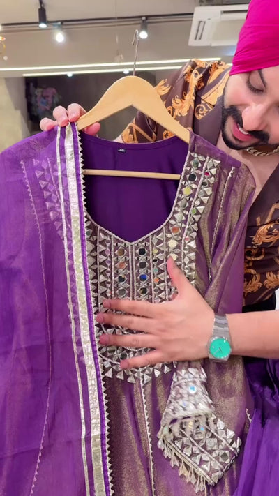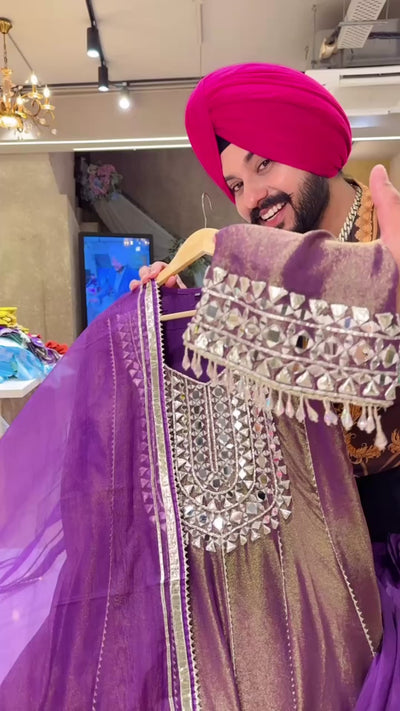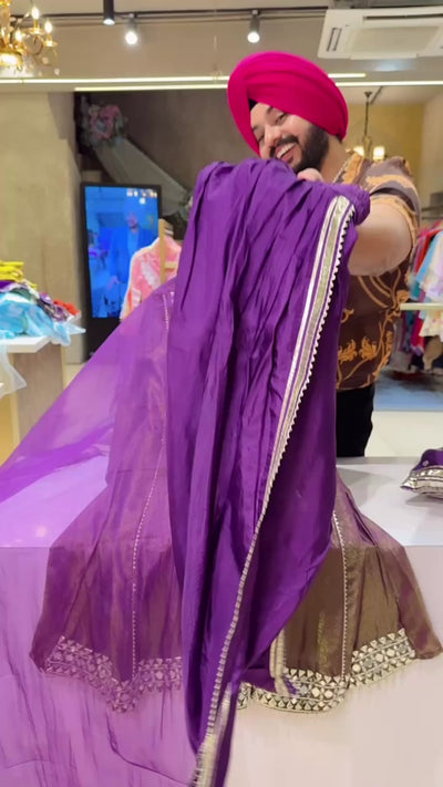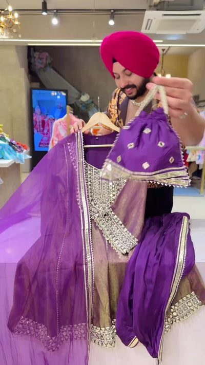 Purple Shimmer Silk Heavy Mirror Work Paplum Tulip Salwar Set with Cute Potli & Organza Gotta Patti Duppata