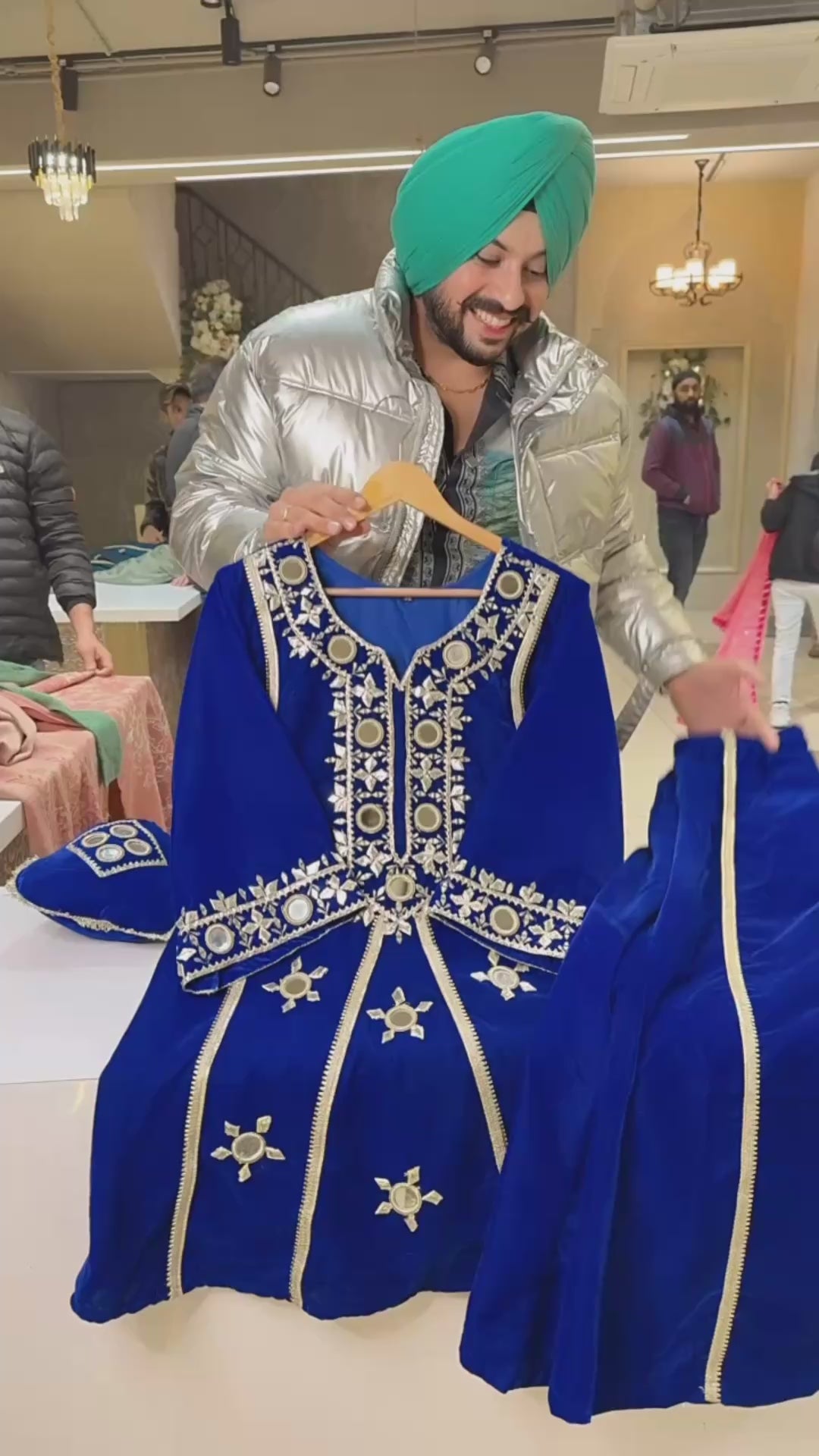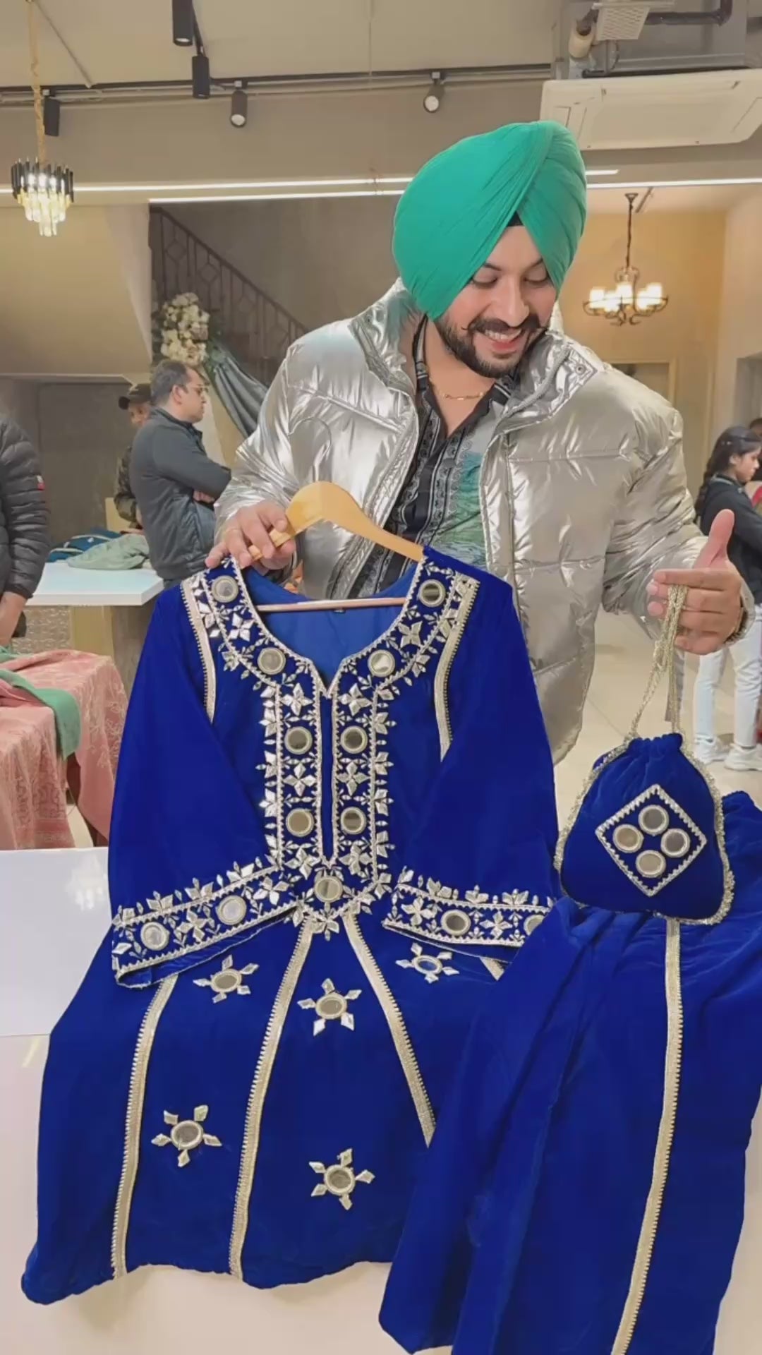 Vibrant Royal Blue Mirror work velvet Paplum Bell Bottom Coord set With Potli