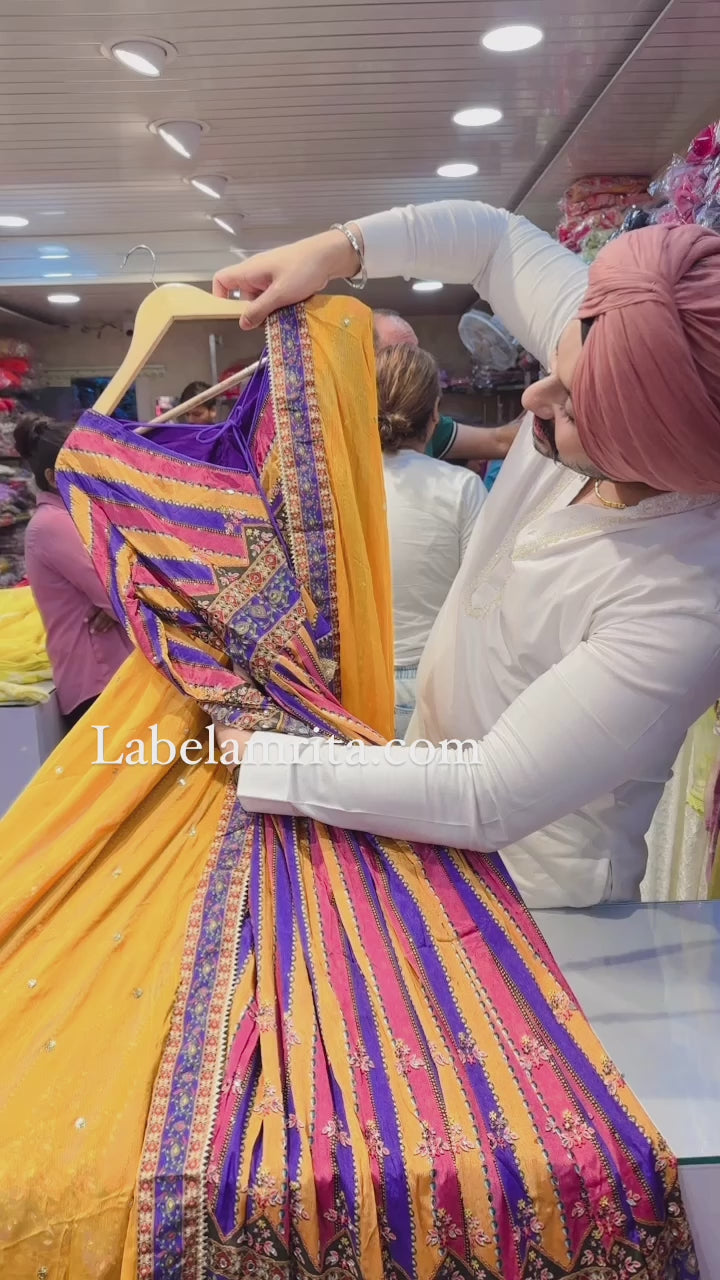 Purple&yellow Chinon V-neck heavy embroidered Anarkali gown with Beautiful Duppata