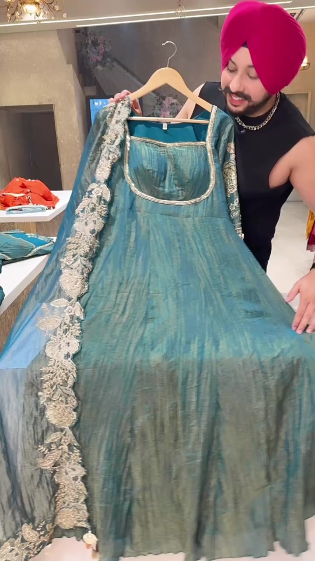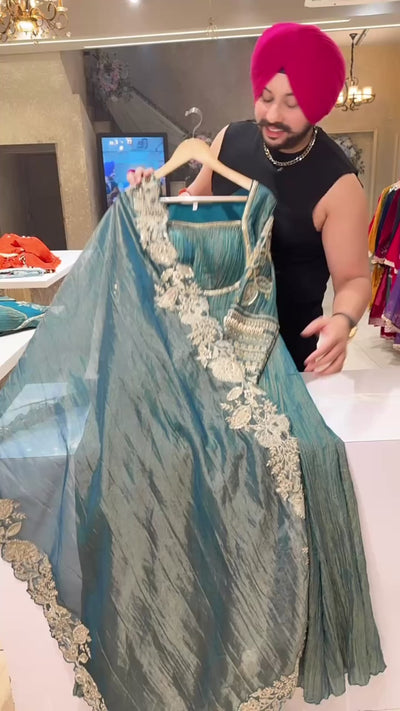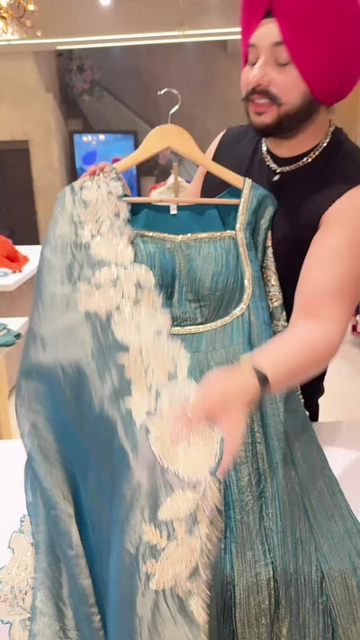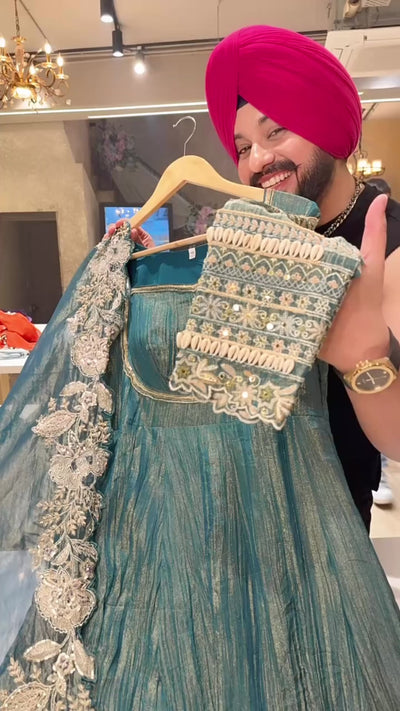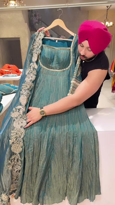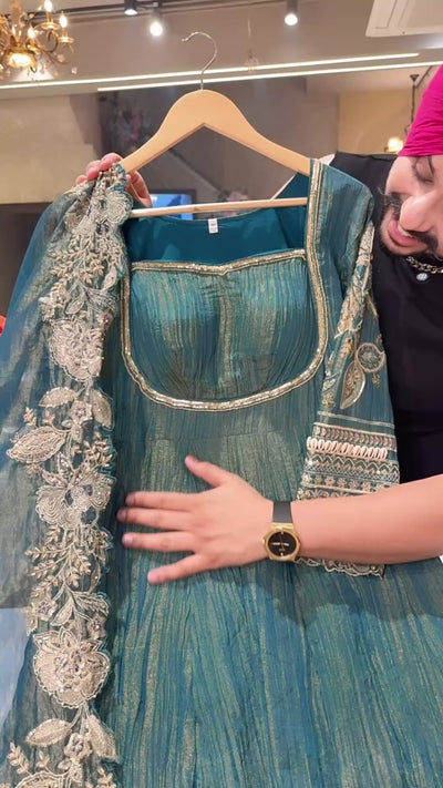 Rama Green Crush Shimmer Tissue Full Flair Padded Anarkali Gown With Heavy Hand Embroidery Work On Sleeves & Duppata