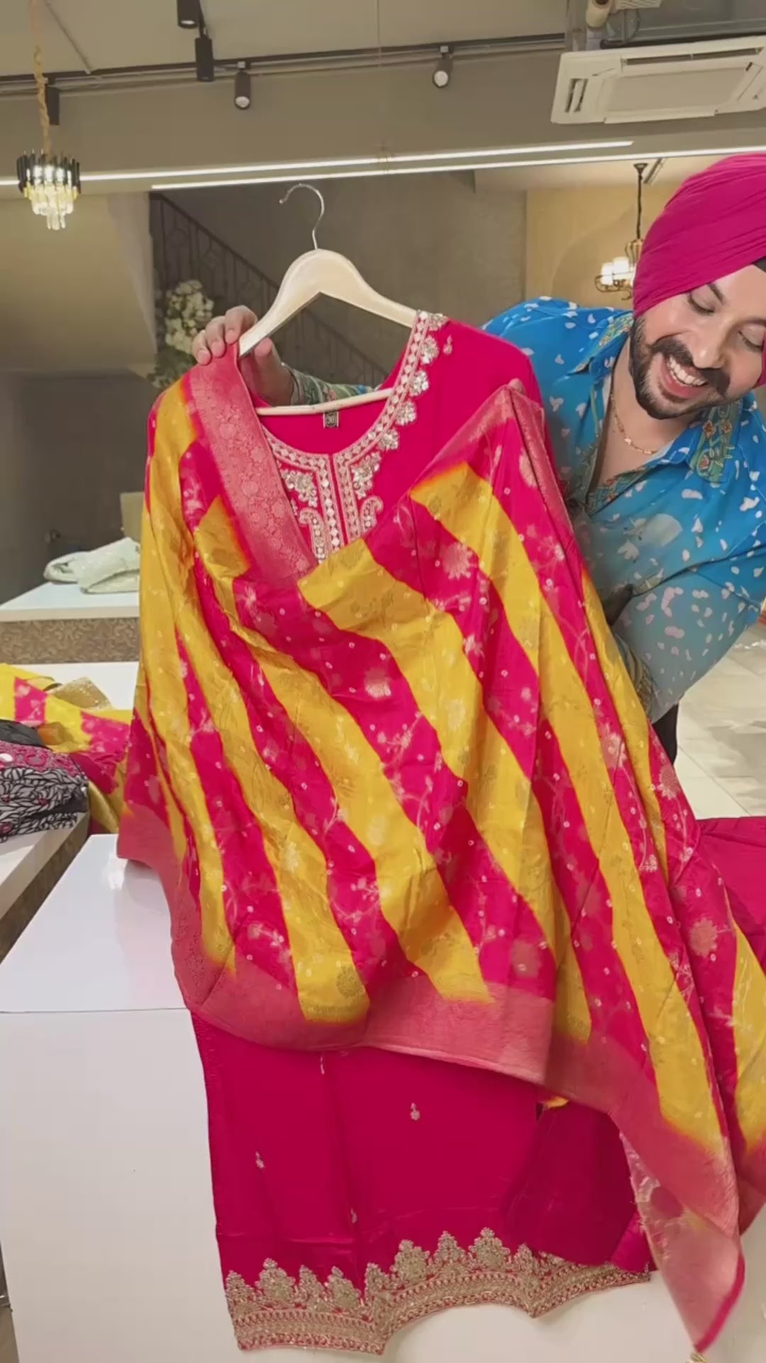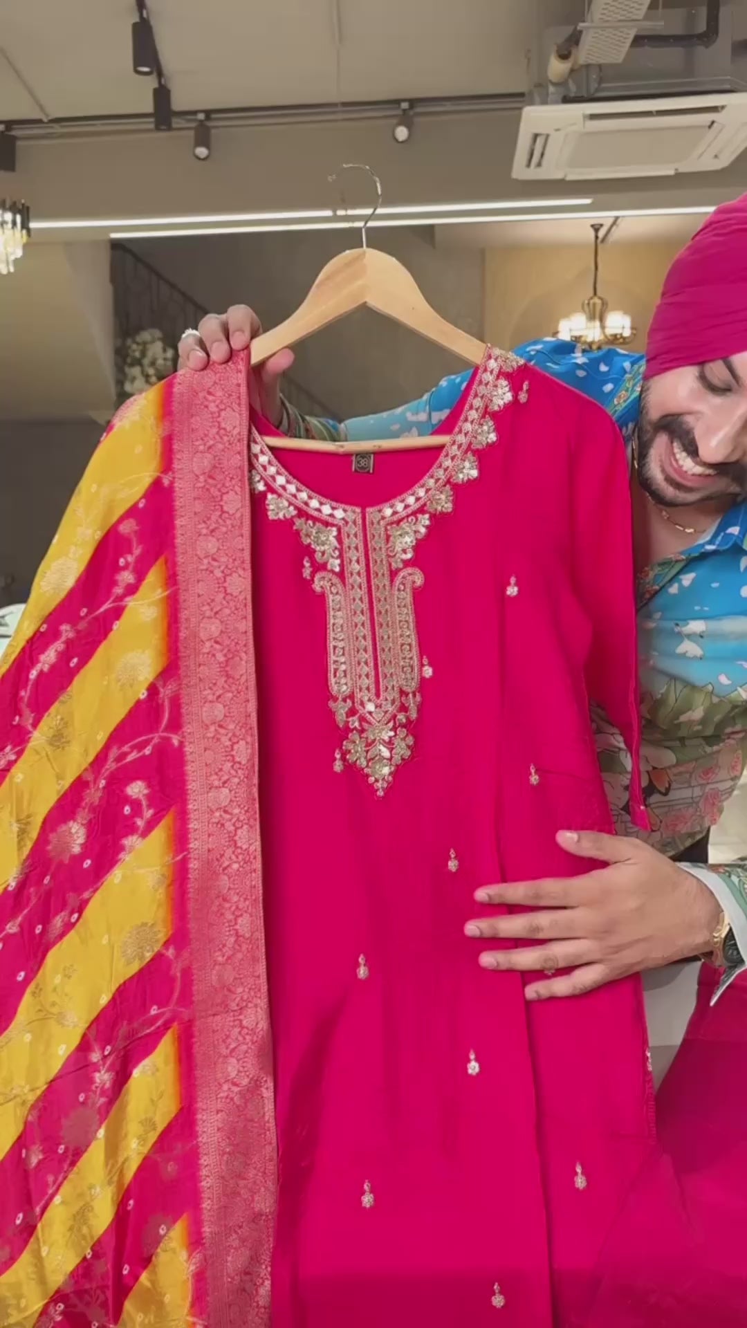 Rani pink Muslin silk embroidered Straight Suit with Banarasi Lehriya Duppata