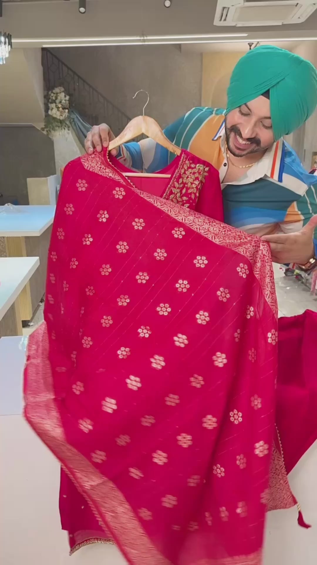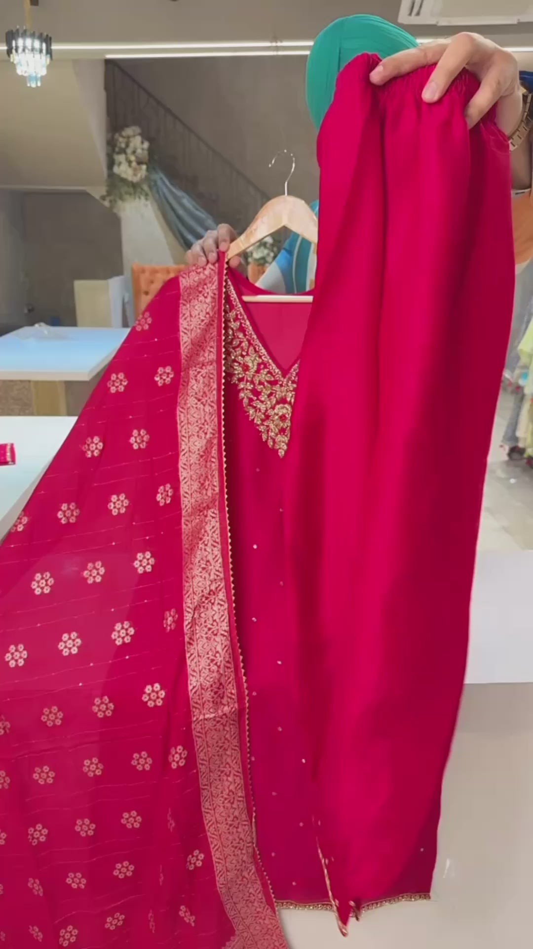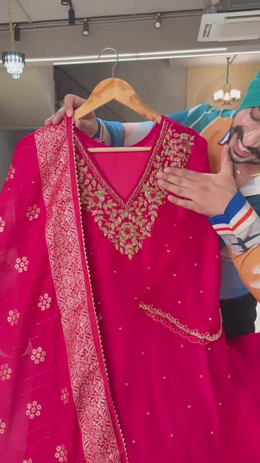 Rani pink Chinon Hand embroidered Pakistani suit with Pathani pants
