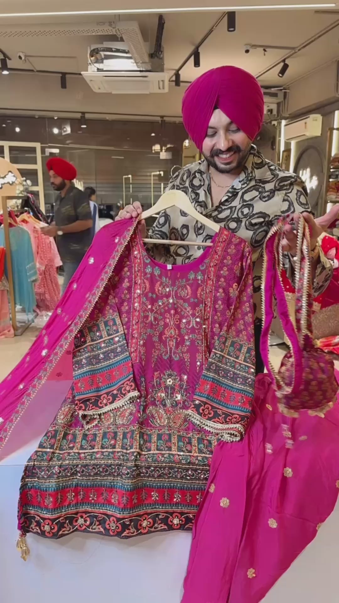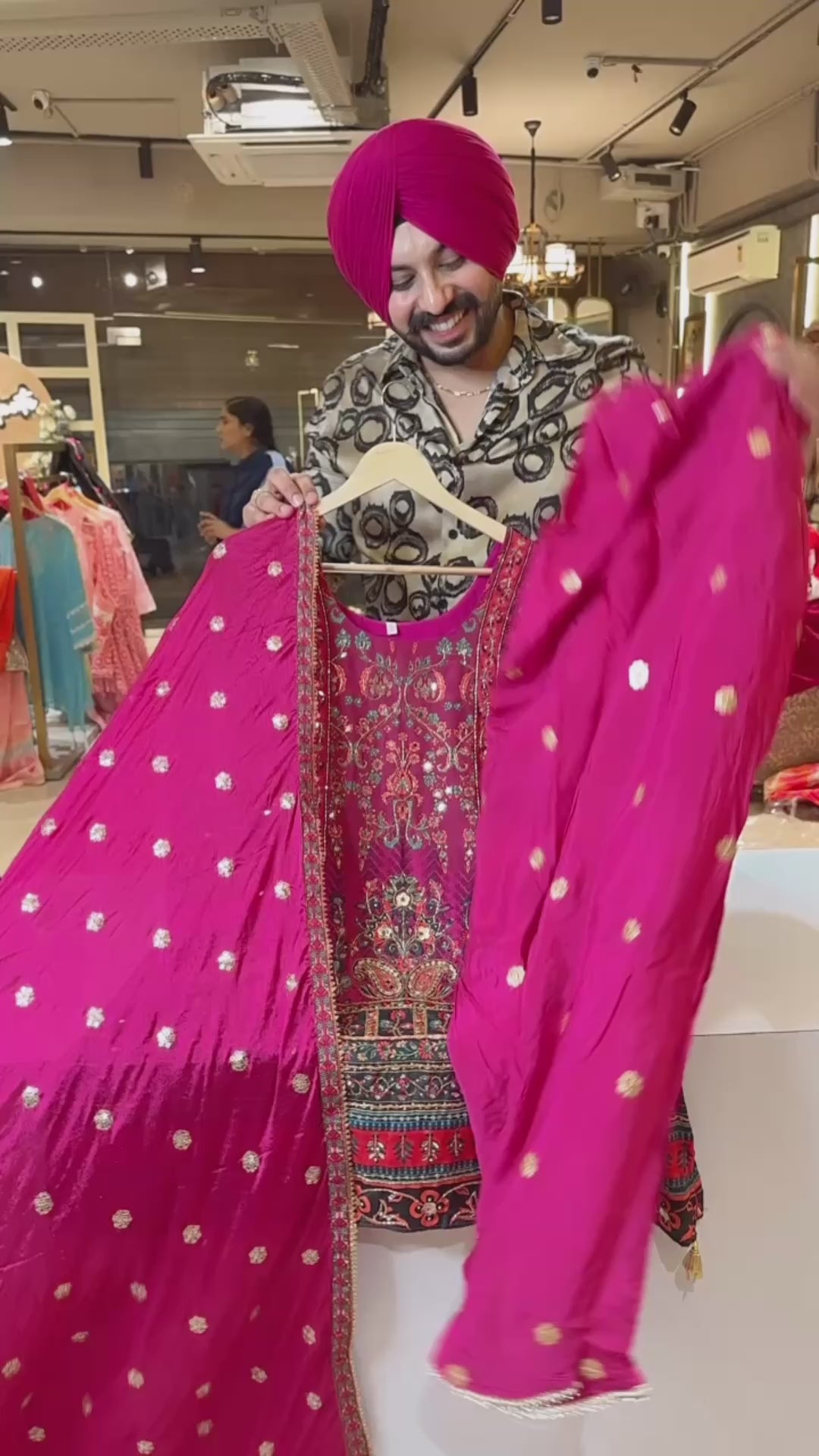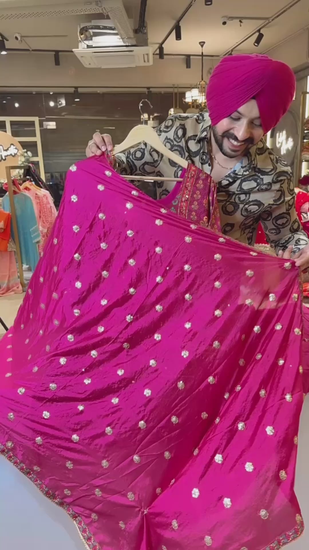 Rani pink crepe Heavy embroidered Dhoti suit with cute Potli