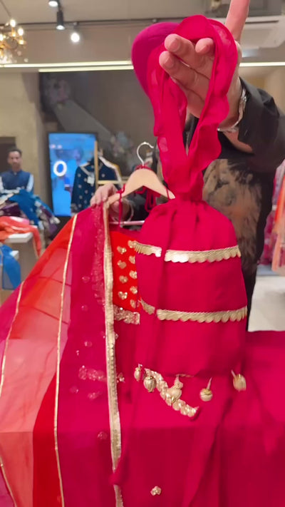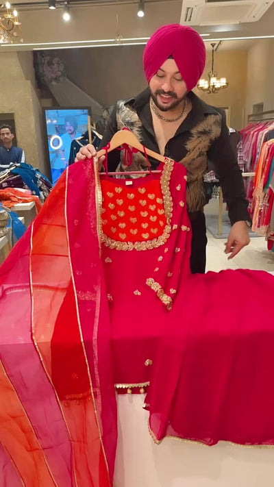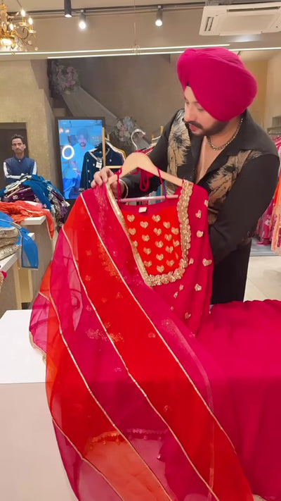 Rani pink Georgette Heavy Hand embroidered Party wear Sharara Suit with organza Duppata & Cute Potli