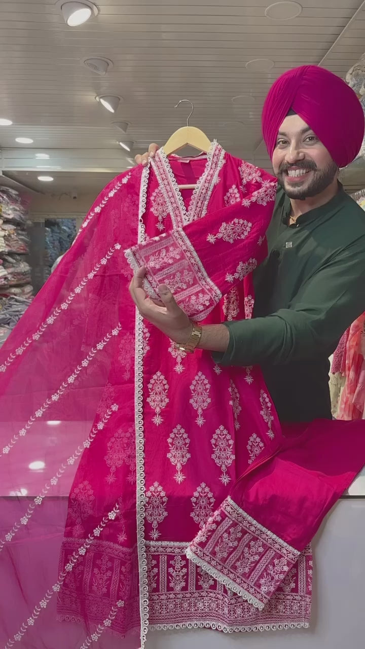 Rani pink Rayon Embroidered Pakistani Suit with organza Duppata