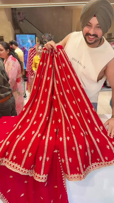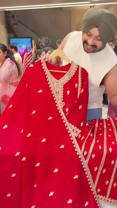 Vibrant Red Chinon Fully Embroidered Full Flair Sharara Set with beautiful Duppata