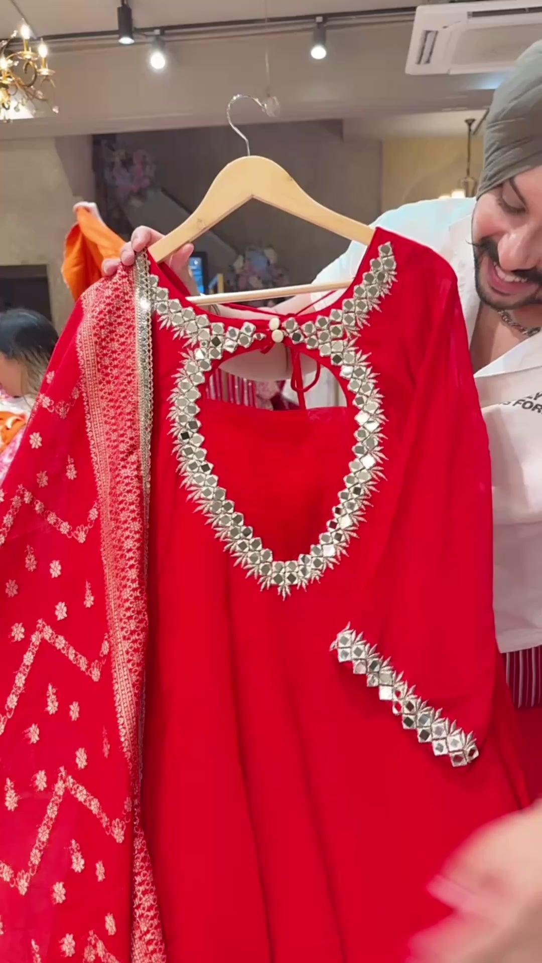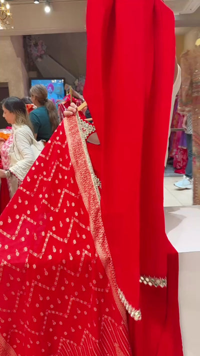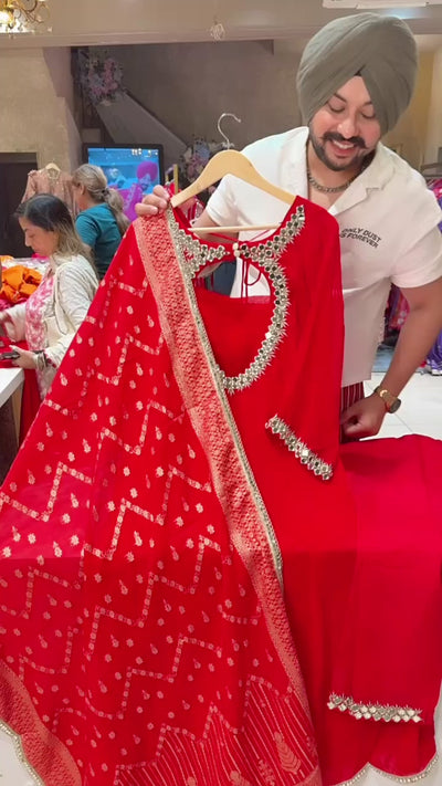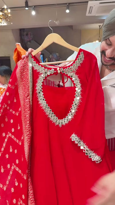 Vibrant Red Georgette Backless Anarkali Suit with Mirror Work on Designer neck & Banarasi look Duppata