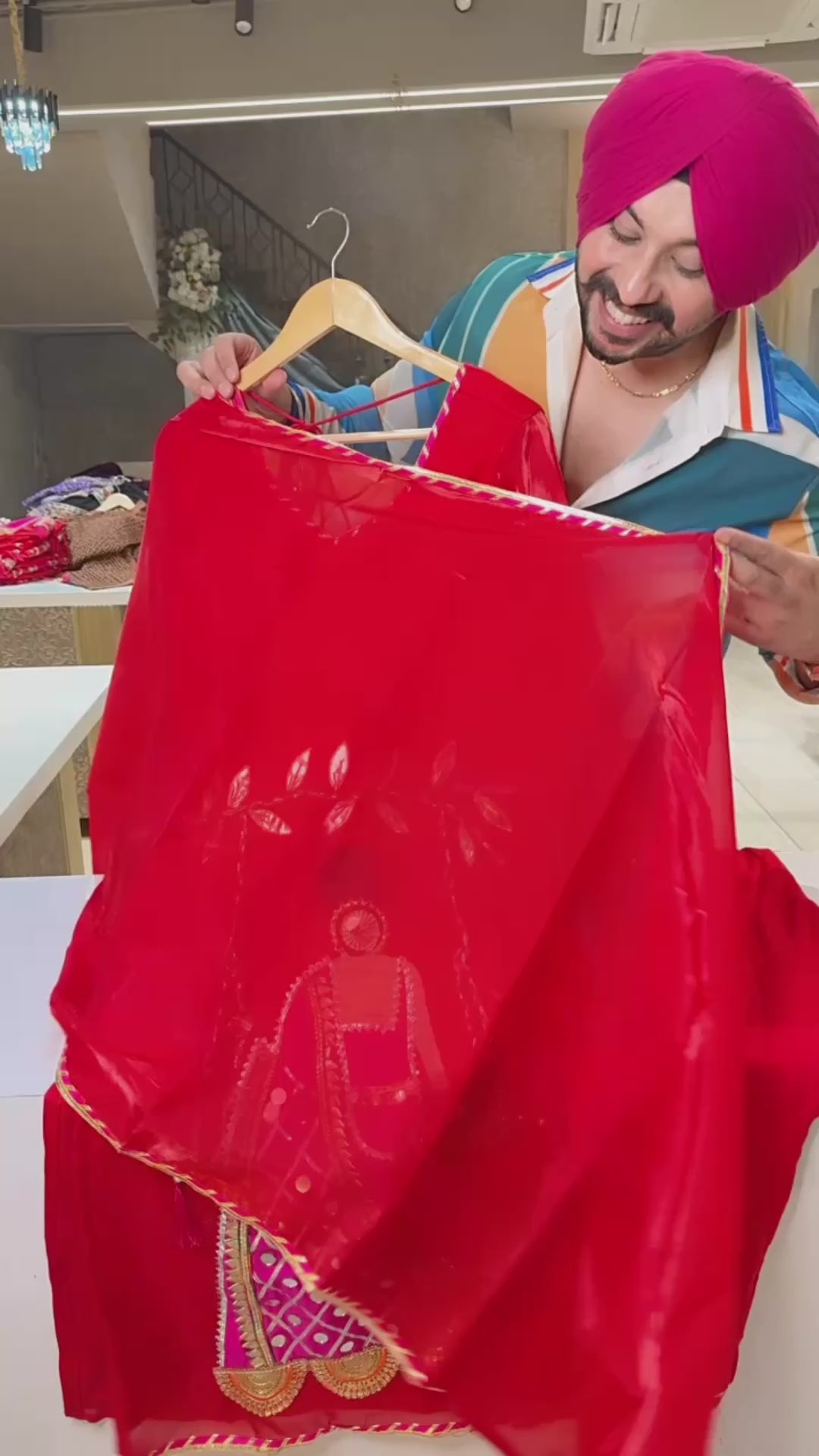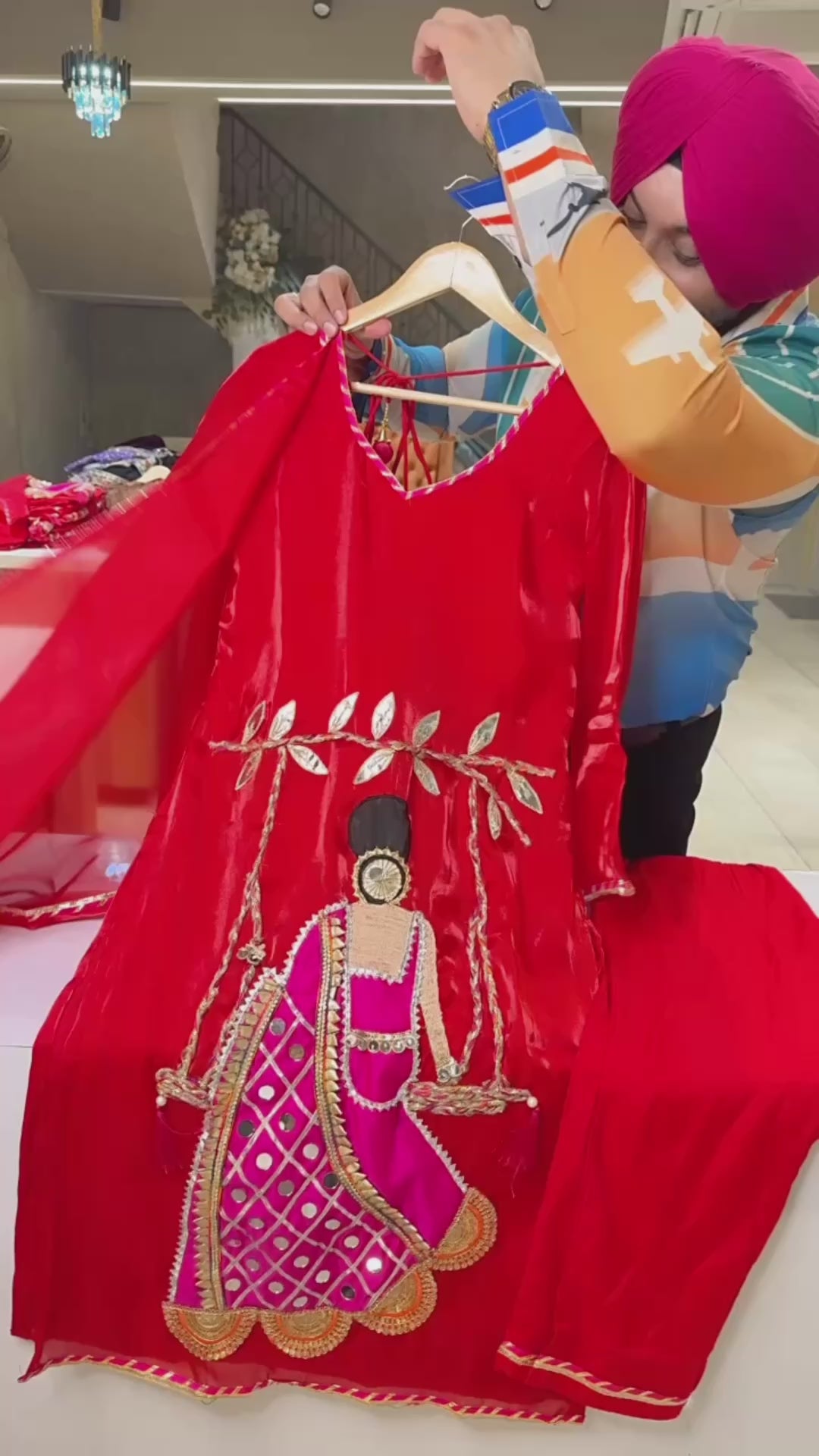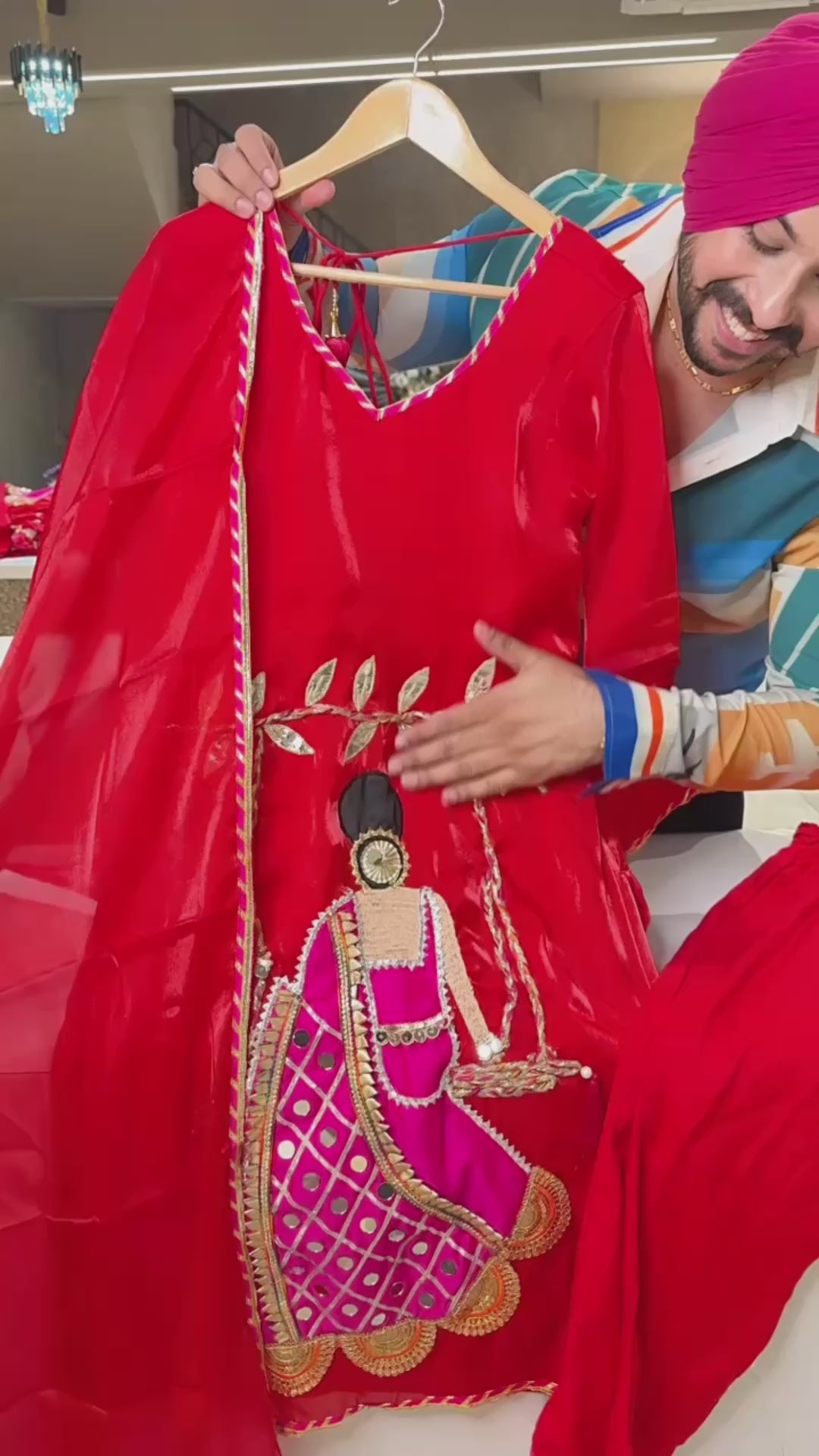 Red doll Embroidered Glass Shimmer Tissue Straight Suit
