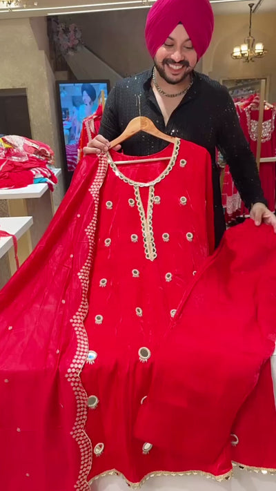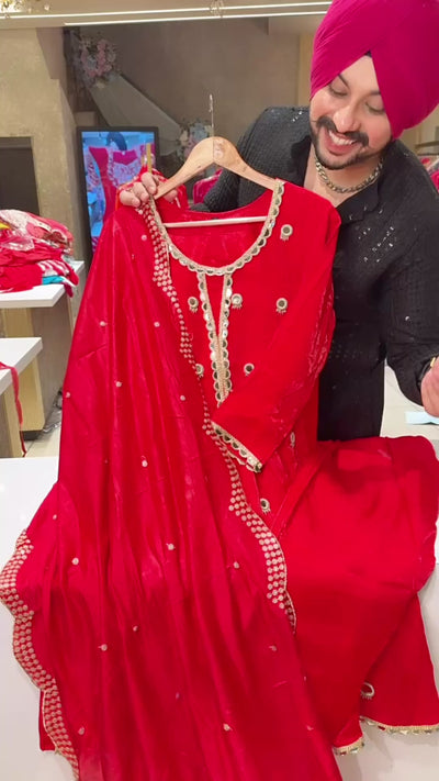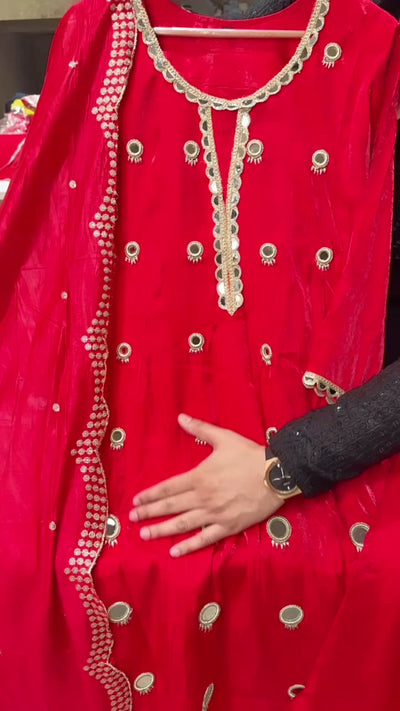 Red Glass Tissue Heavy Mirror Work Short Anarkali Suit with Embroidered Silk Duppata
