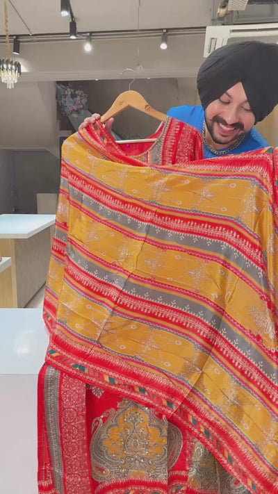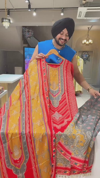 Red & Grey Viscose Crepe Heavy embroidered Straight Suit