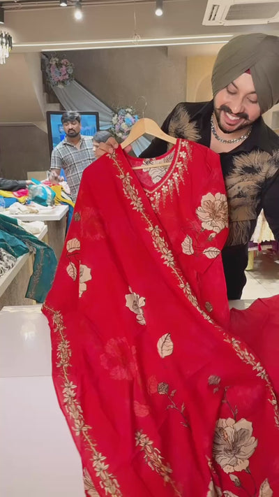 Red Pure Cottton floral Print Straight Suit with Hand Embroidery work on neck