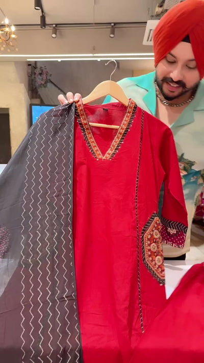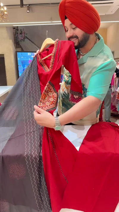 Reddish Maroon Pure Cotton A-line Plazo Suit with Beautiful Embroidery Work on neck & pockets