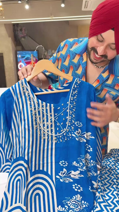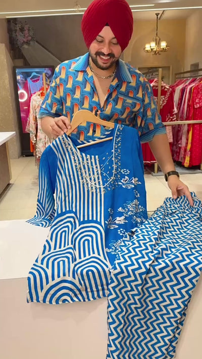 Royal Blue Crepe party Wear Coord set with Hand embroidery Work on neck
