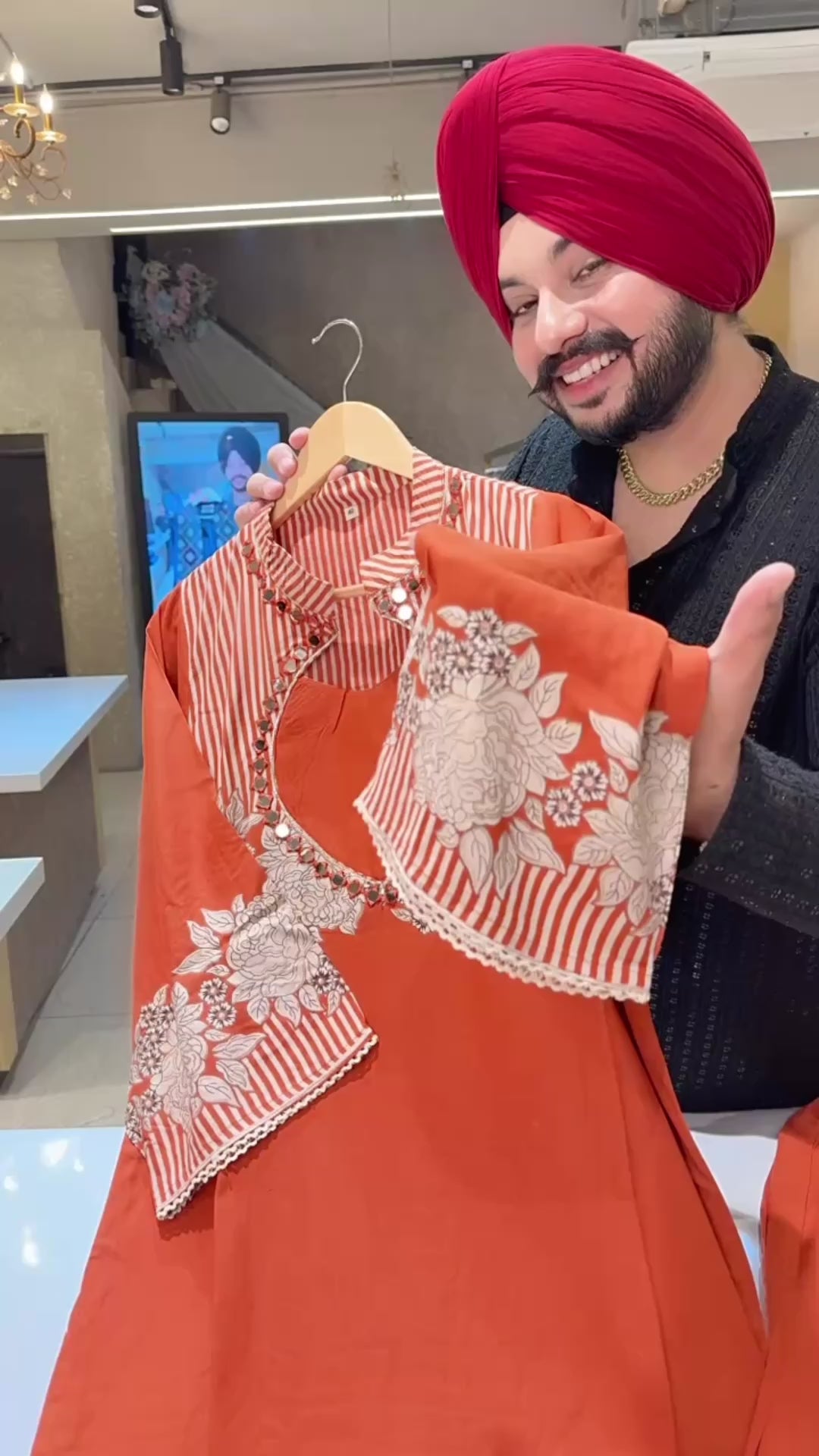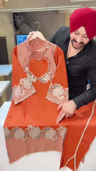 Rust Colour Rayon Designer neck C-cut Long Length Coord set with Stylish Tulip Pants
