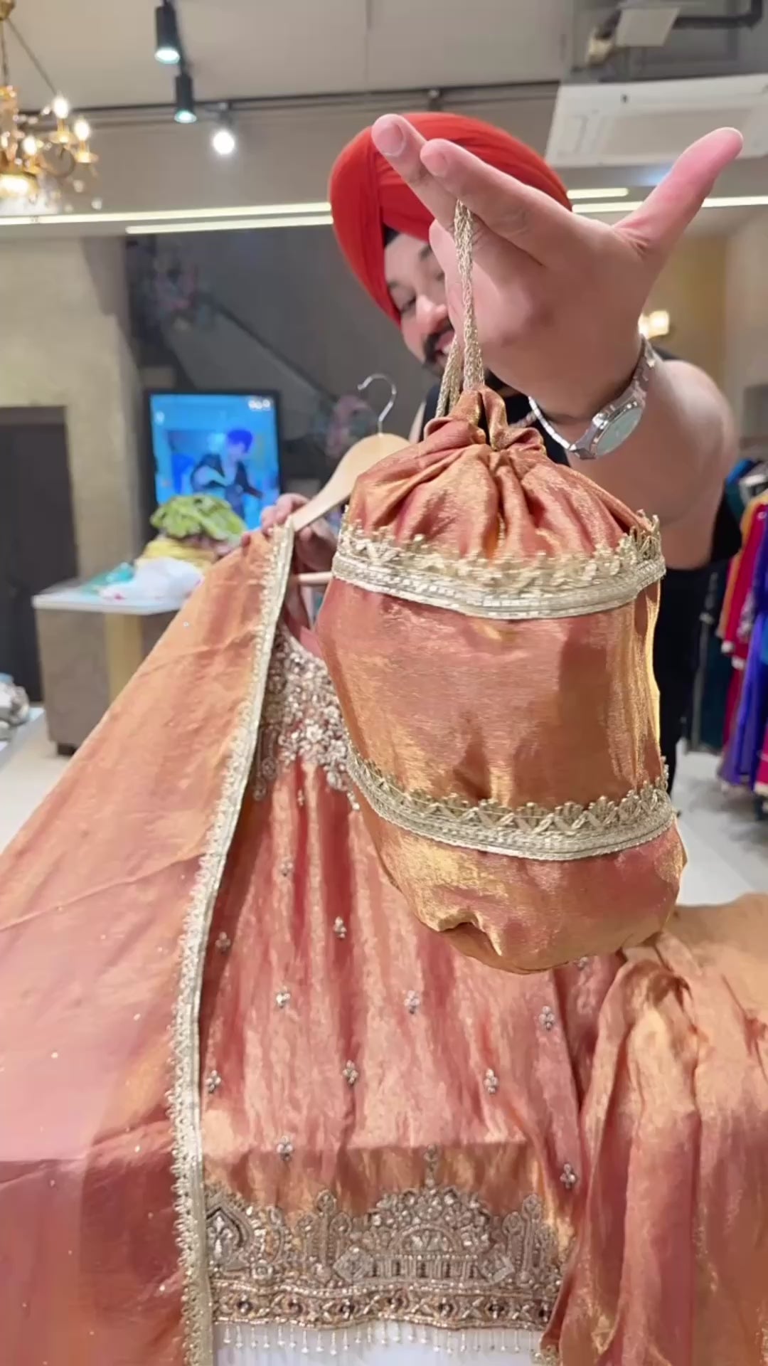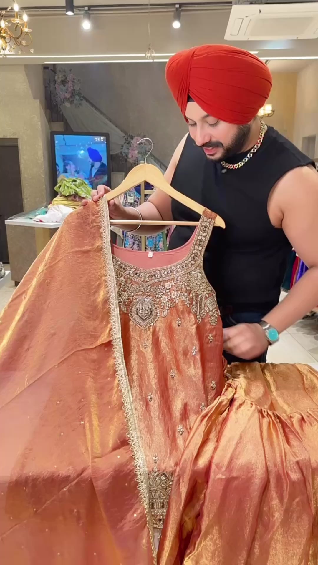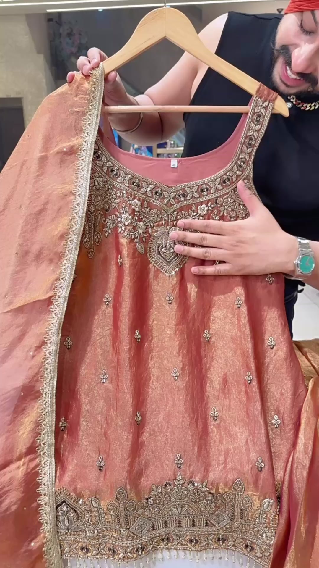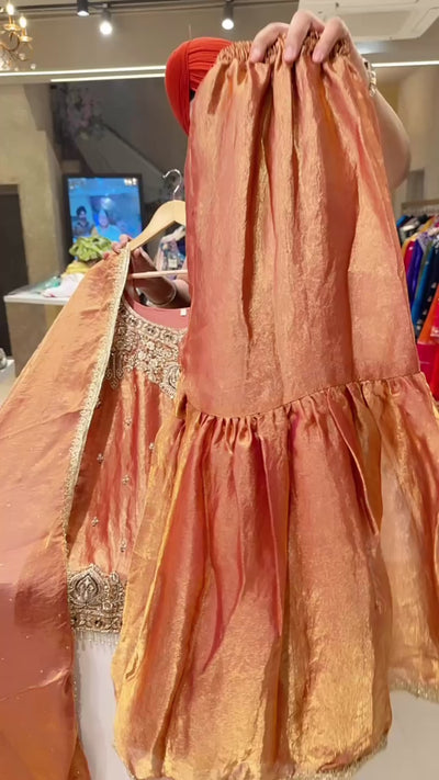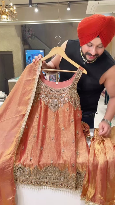 Rust Crush Shimmer Tissue Heavy Hand Embroidered Garara Suit
