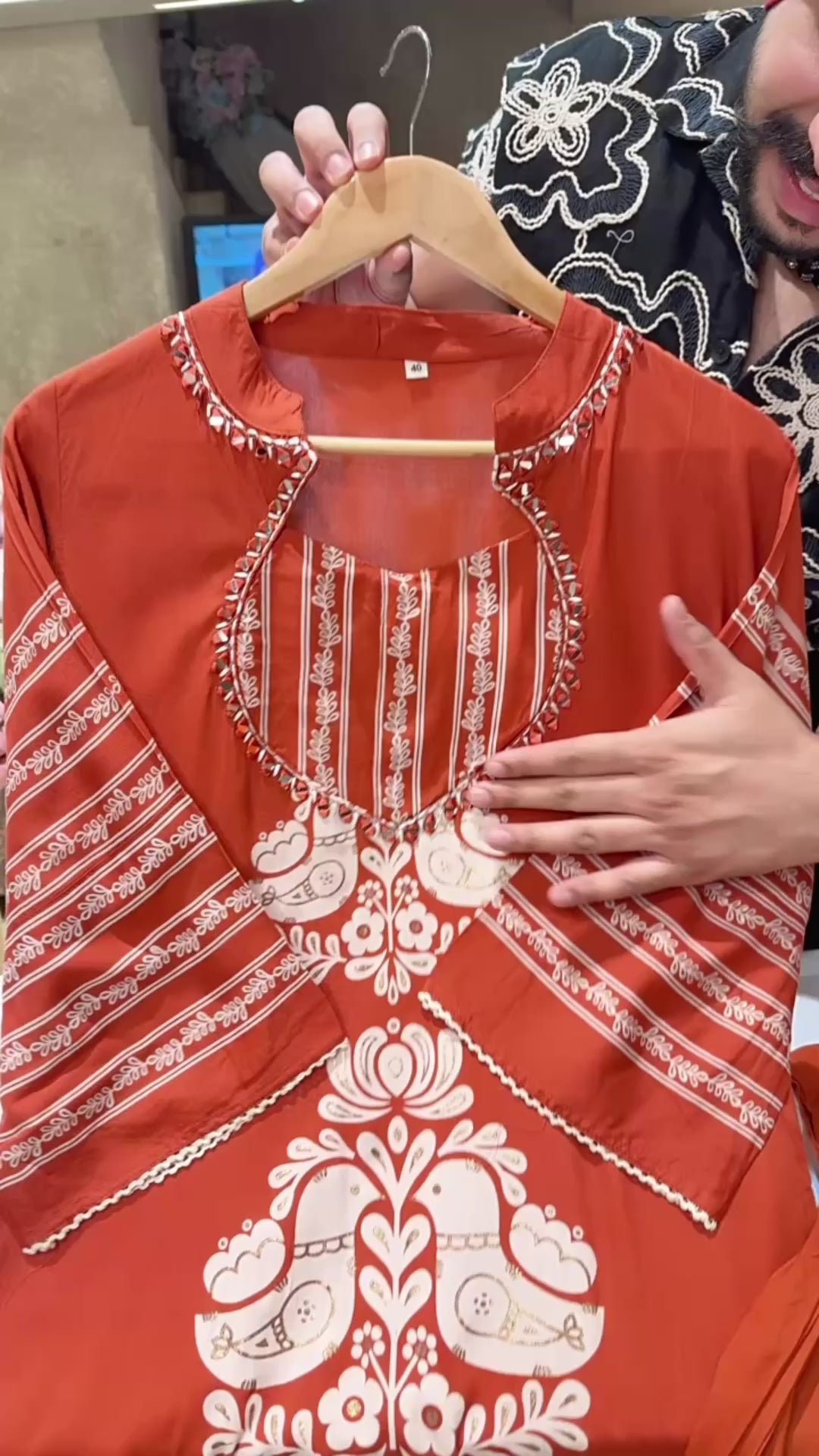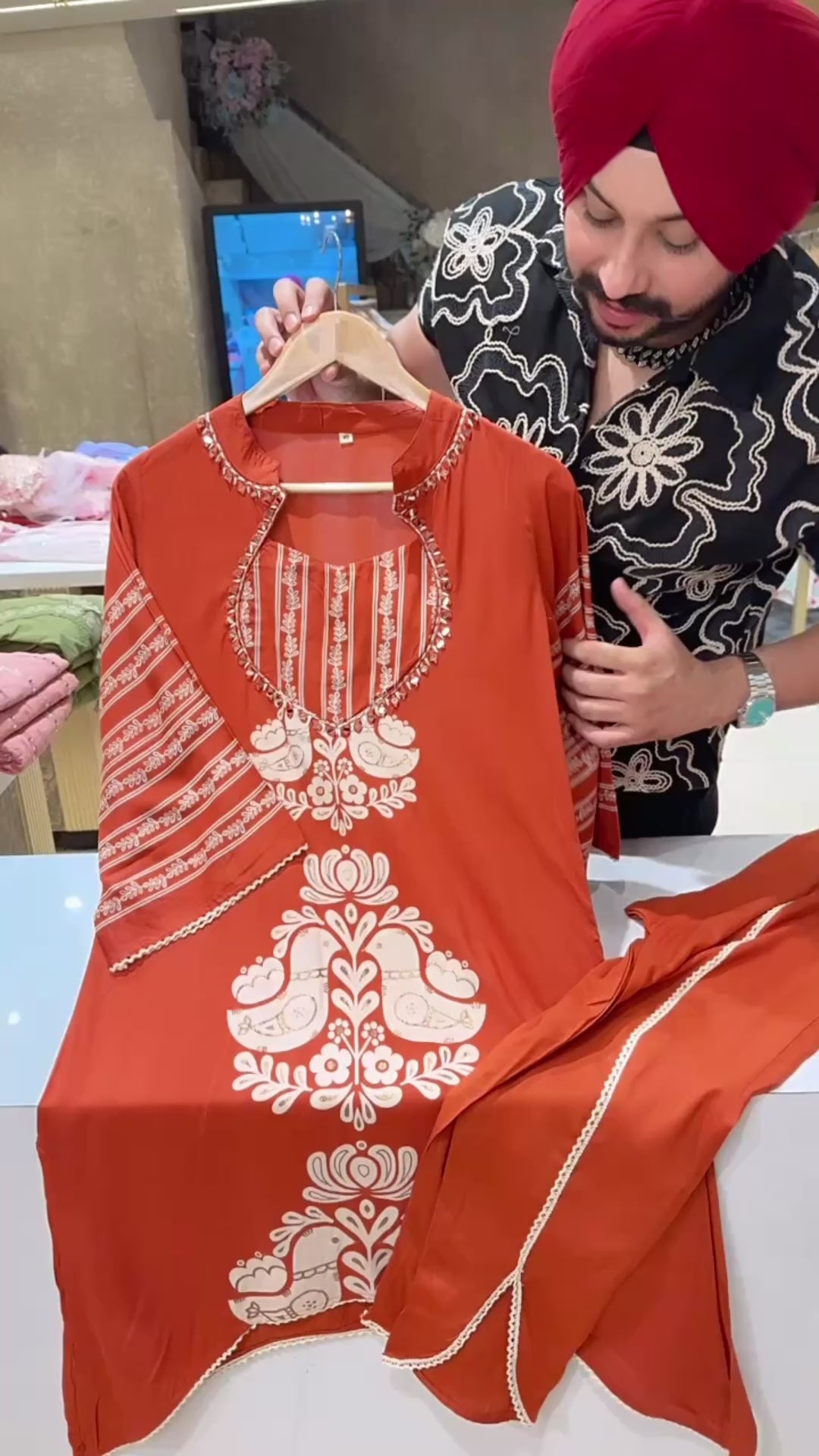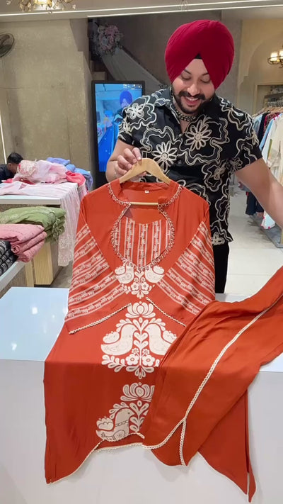 Rusty Orange Designer mirror Neck Long Length c-cut Coord set with Stylish Tulip Pants