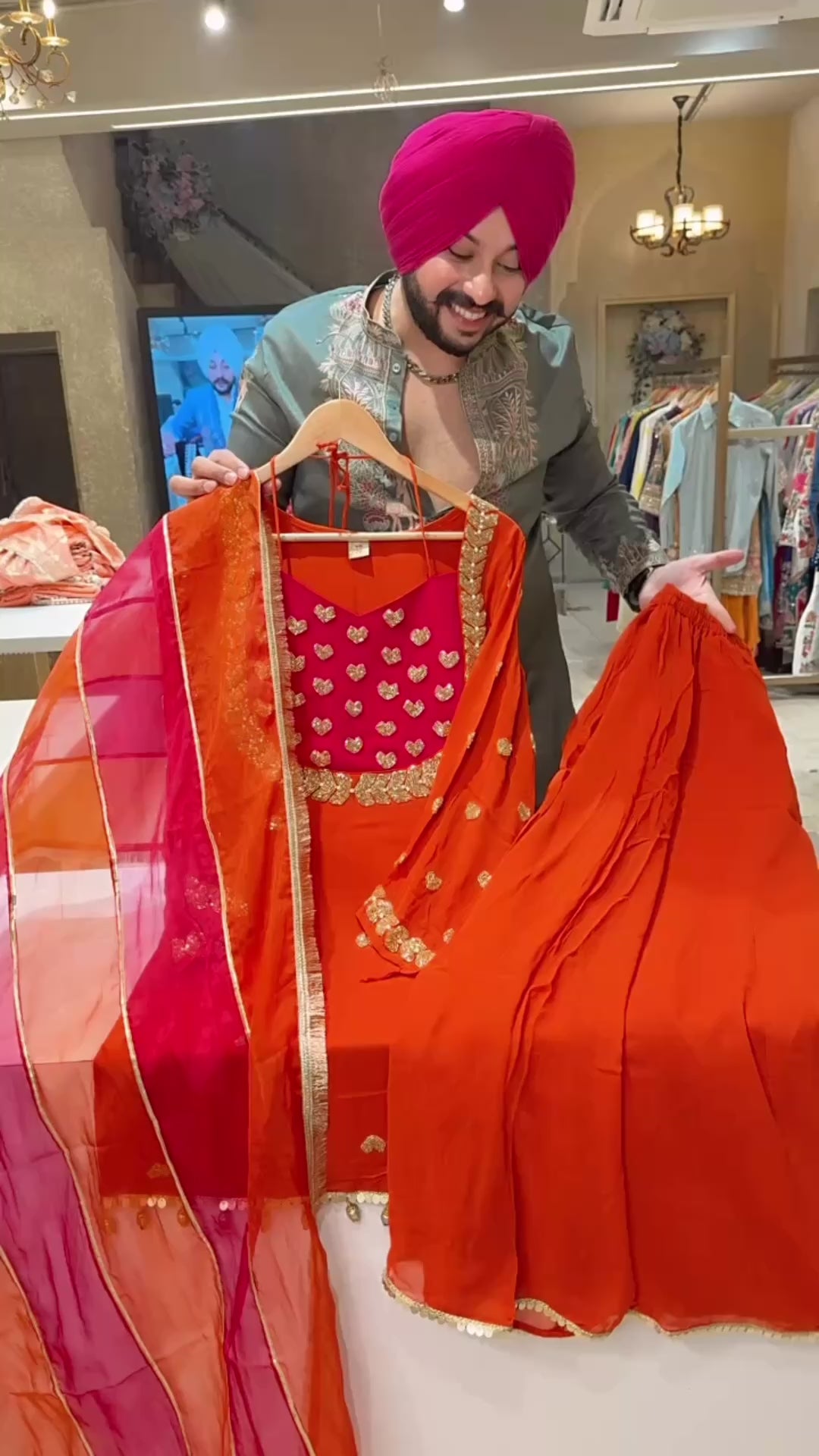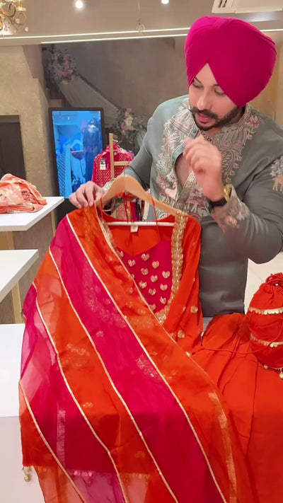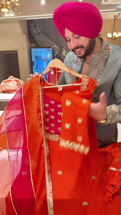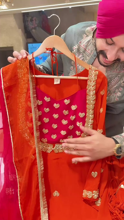 Rusty orange Georgette Heavy Hand embroidered Party wear Sharara Suit with organza Duppata & Cute Potli