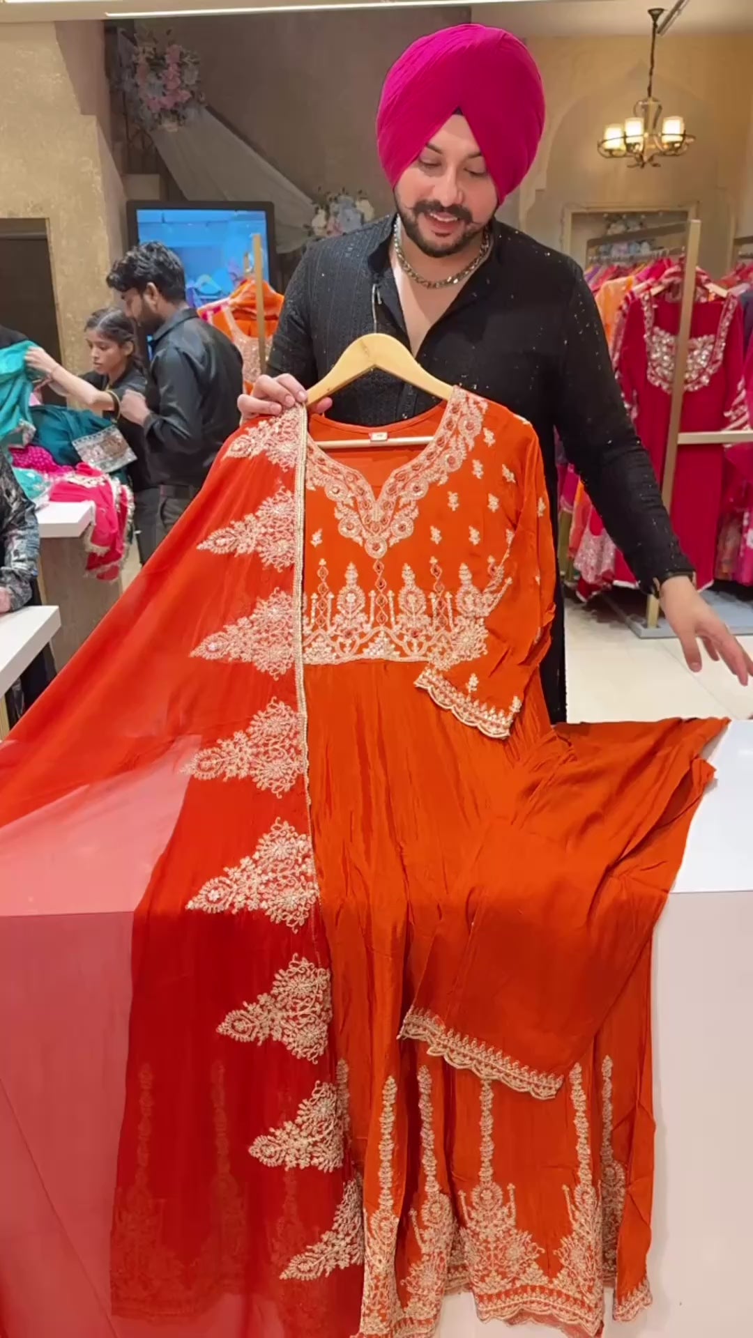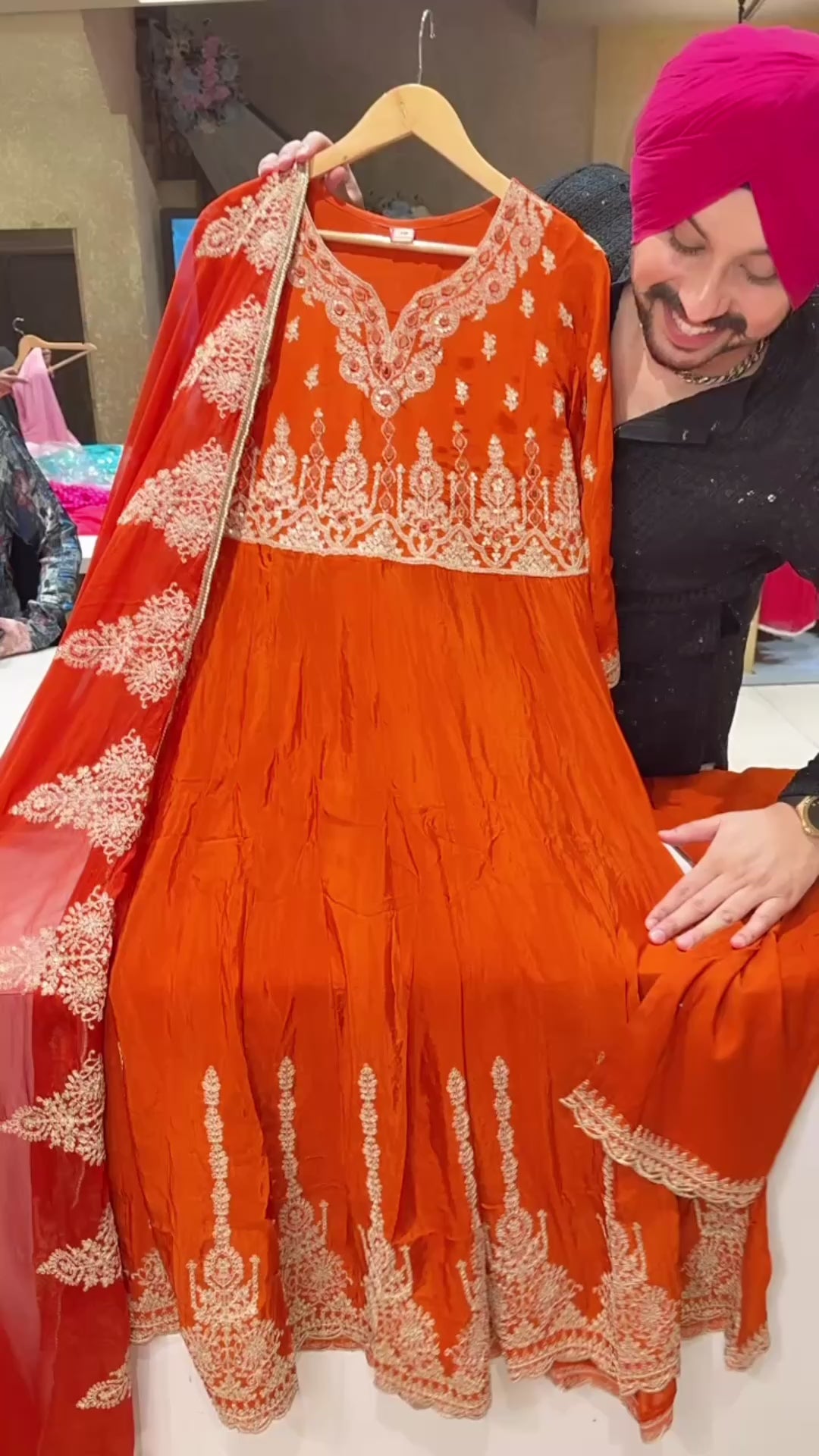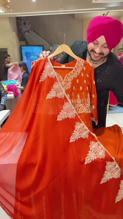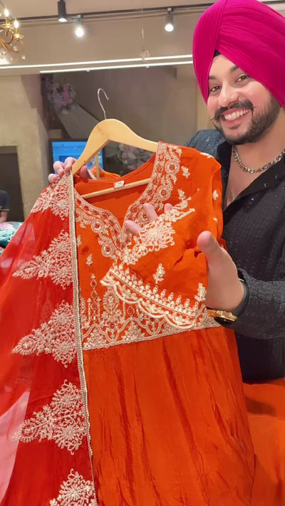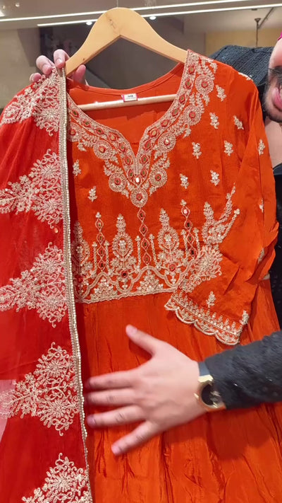 Rusty Orange Pure Chinon Heavy embroidered party Wear Anarkali Suit with Single Side Embroidered Duppata