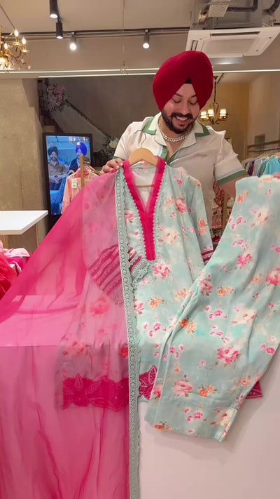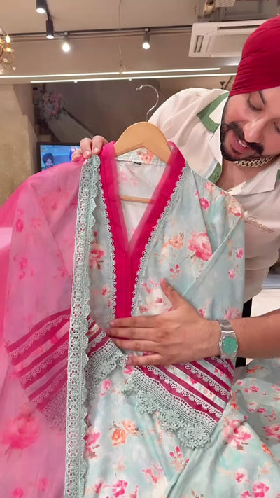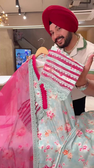 Sea Blue Beautiful linen floral pakistani farshi salwar suit with applique work on ghera and bell designer sleeves and organza dupatta