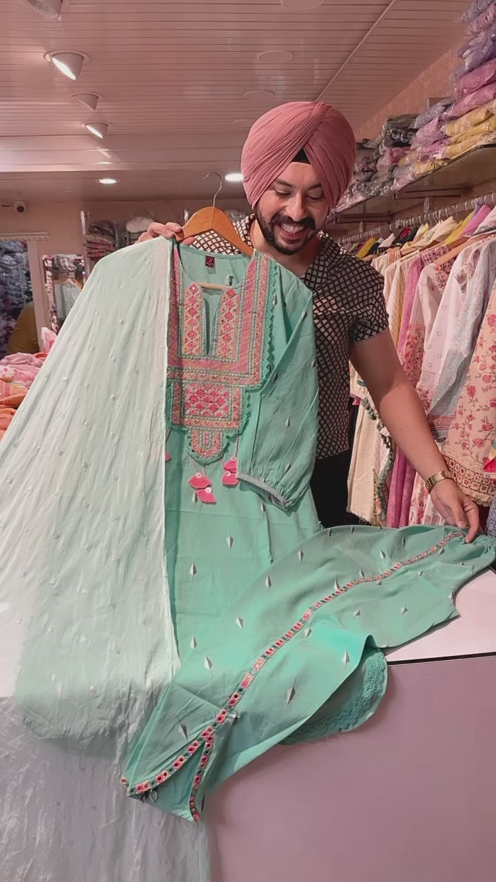 Sea Blue Pure Cotton Apple cut Suit with Stlish Tulip Pants