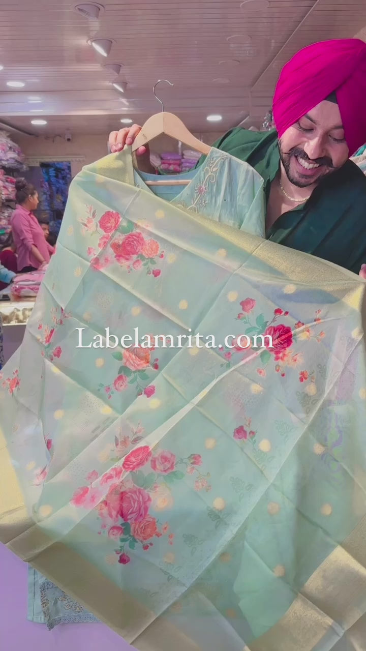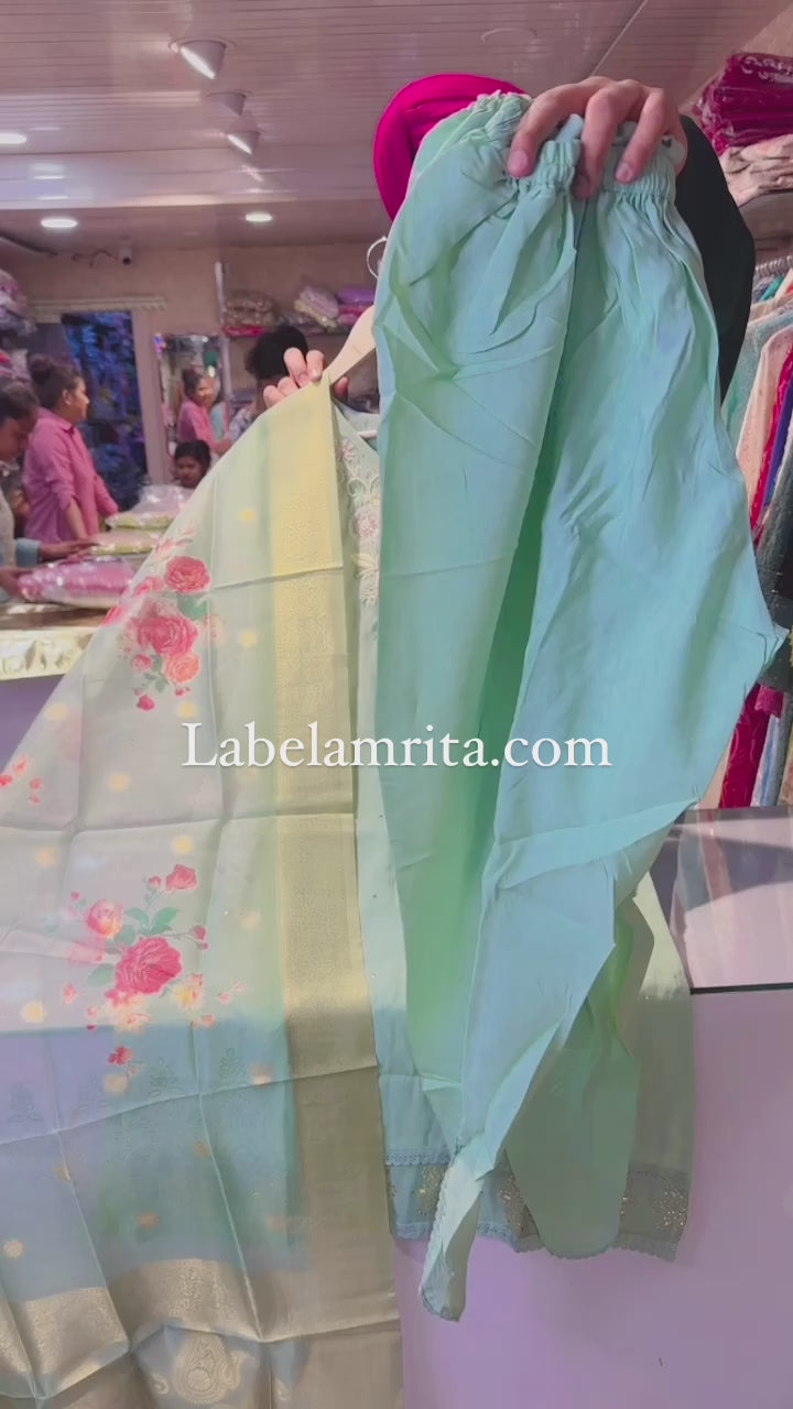 Light Sea Green Roman Silk Handwork Suits with Stylish Tulip Pants & beautiful Duppata