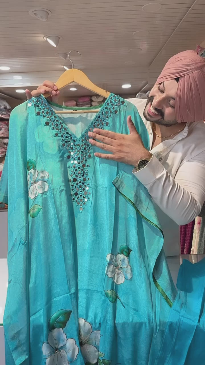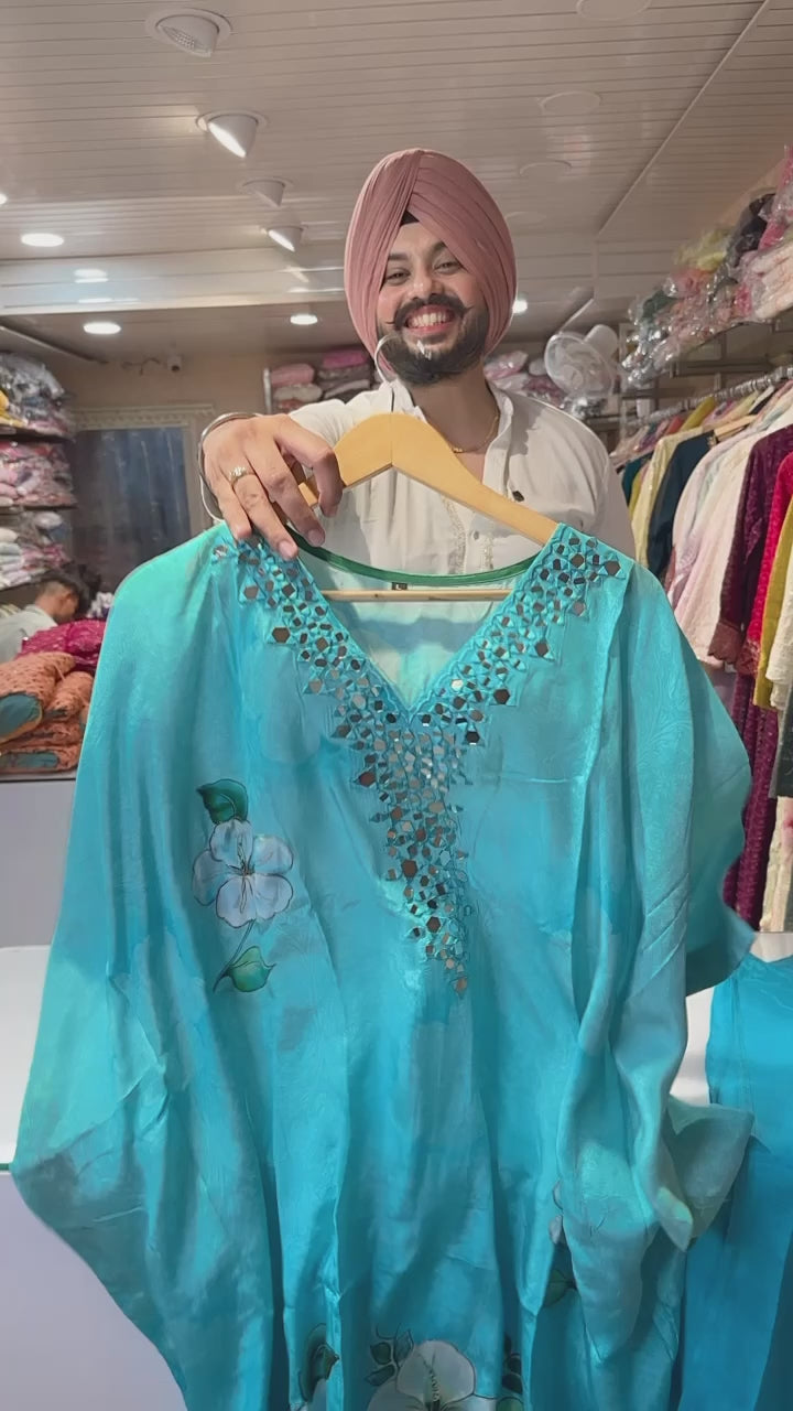 Sea blue Viscose Crepe kaftan Coord set with beautiful mirror work on neck