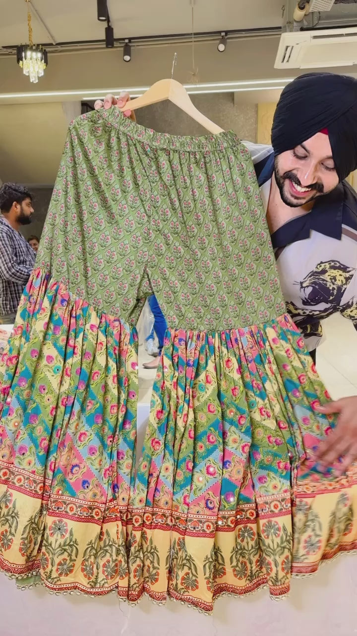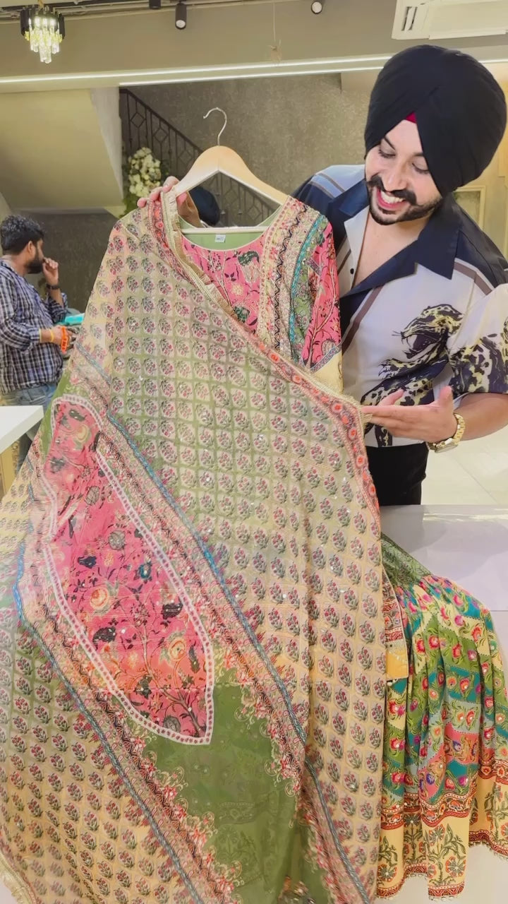 Green & Multicolored Chinon Garara Suit with Heavy Hand work
