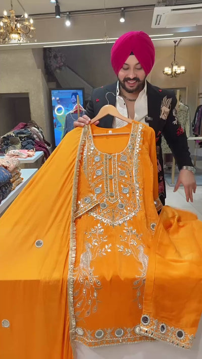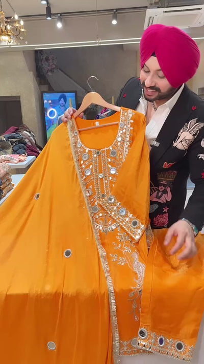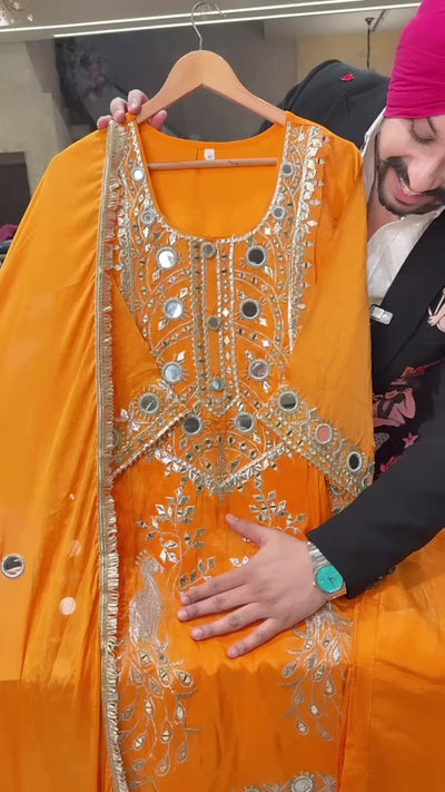 yellowish Orange Shimmer Organza Heavy Gota Peacock & Mirror Embroidered Kashmiri Suit