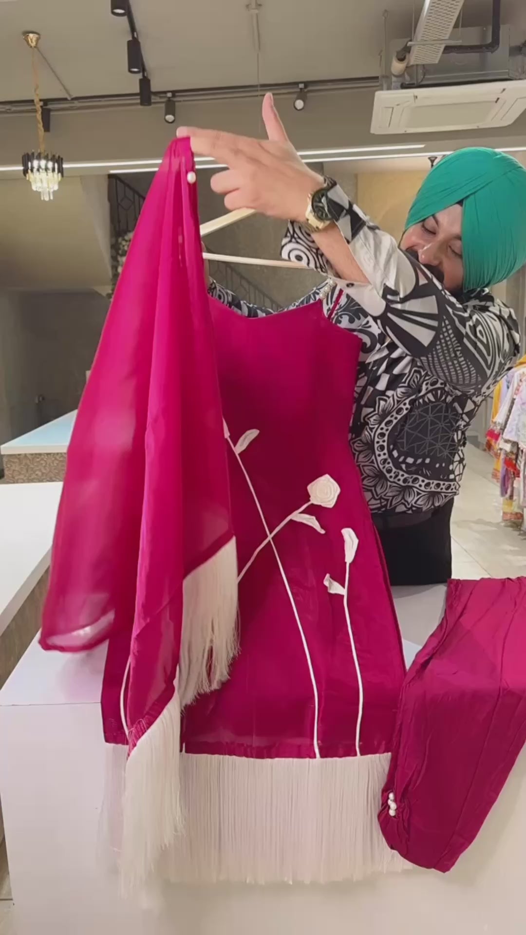 Deep Rani Pearl Noodle Sleeves Shimmer Tissue Straight Suit with Beautiful Fringe lace Duppata