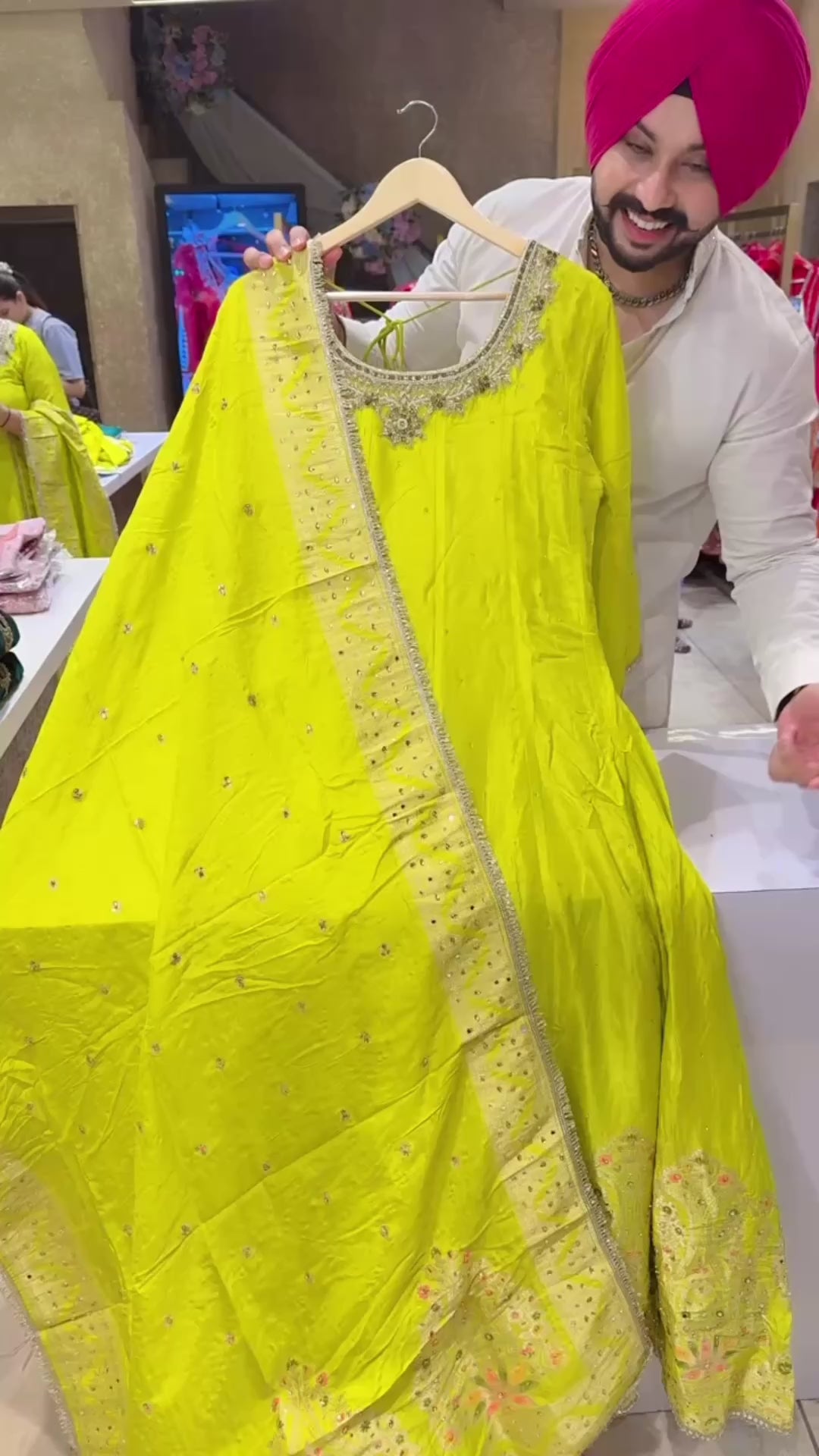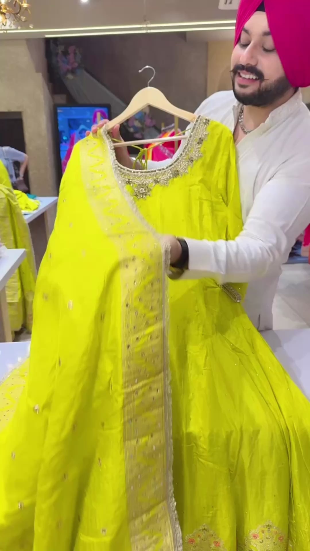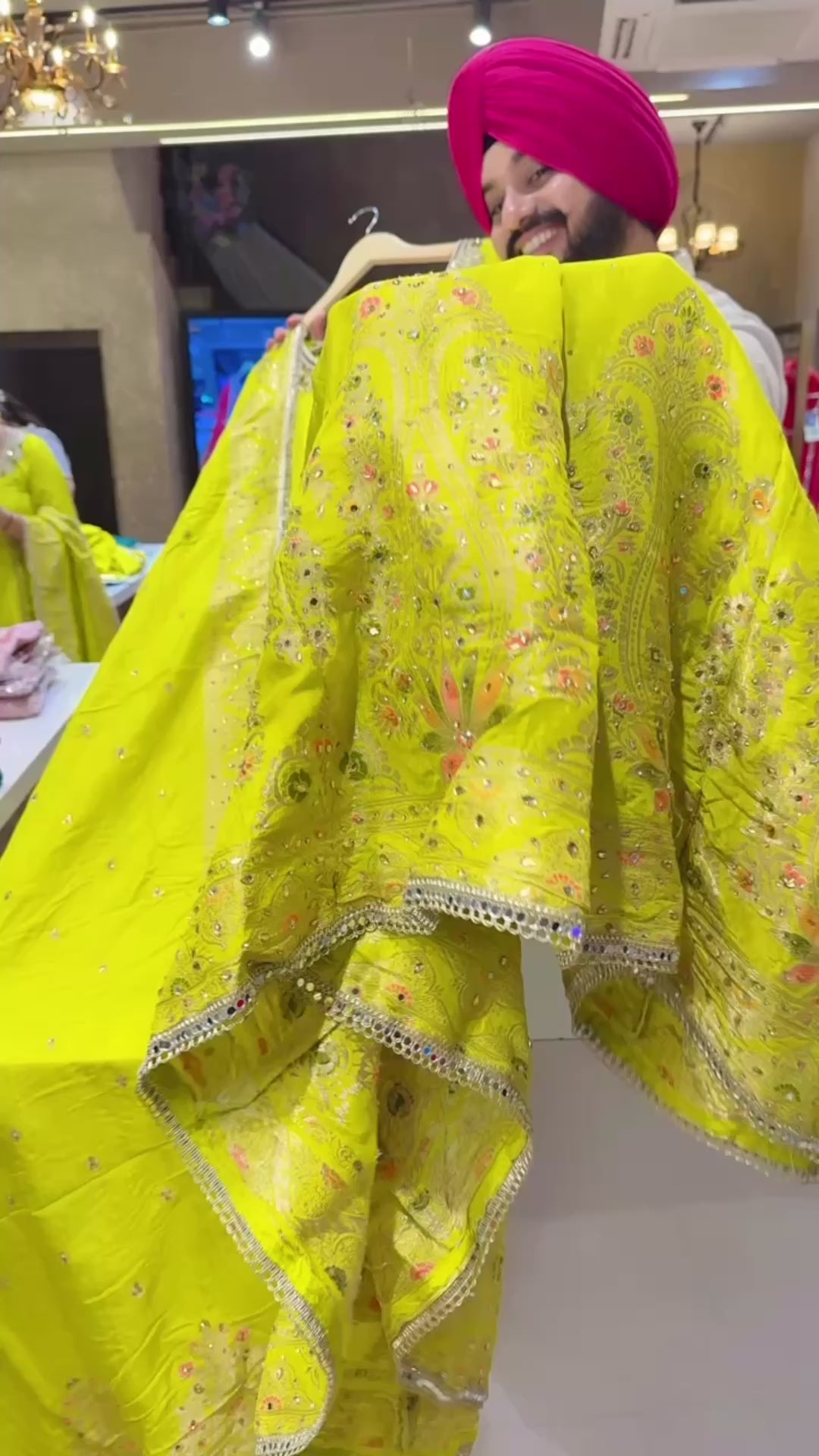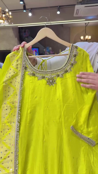 Parrot Green Soft Silk Fill Flair Hand embroidered Anarkali Gown with Heavy Banarasi Border & Duppata
