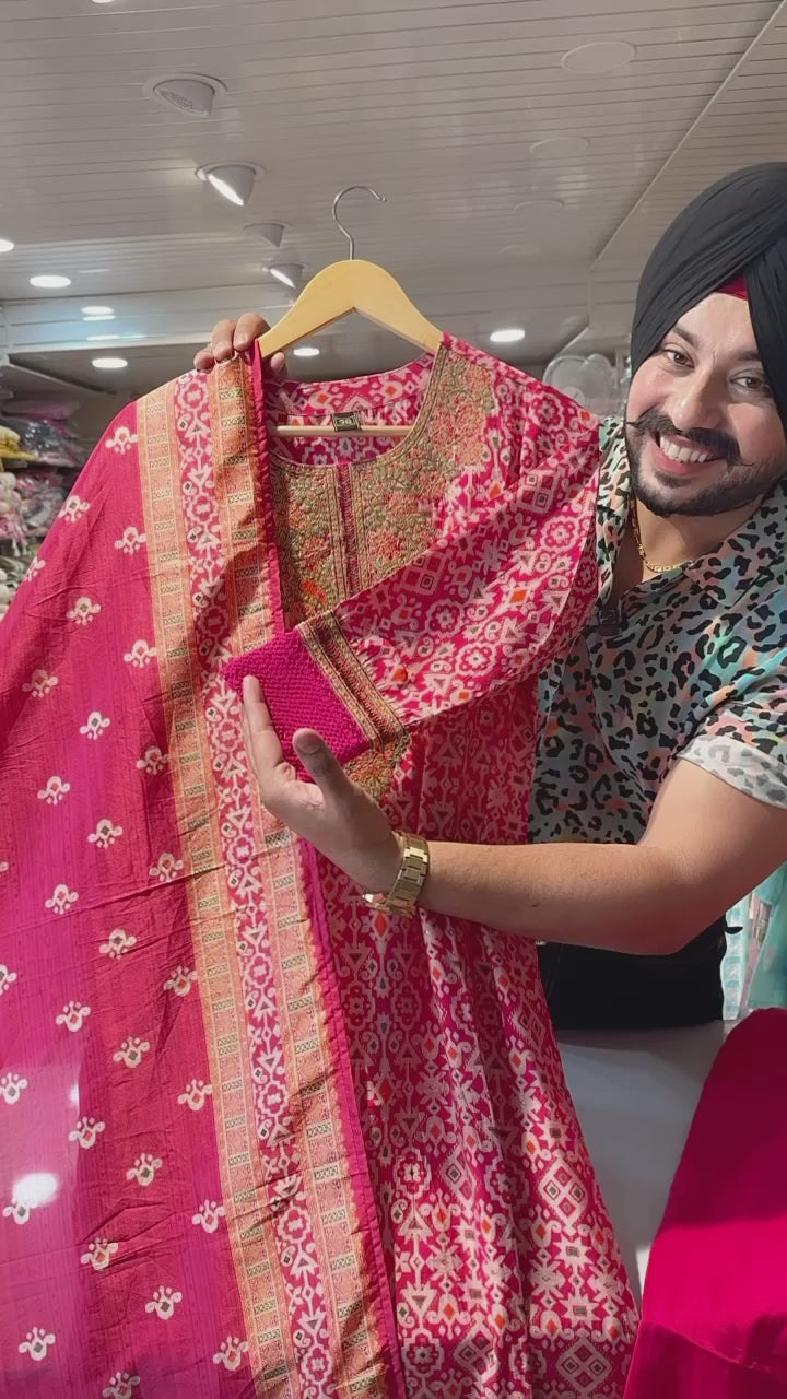 Rani Pink Muslin silk suit with Beautiful embroidery Work on neck